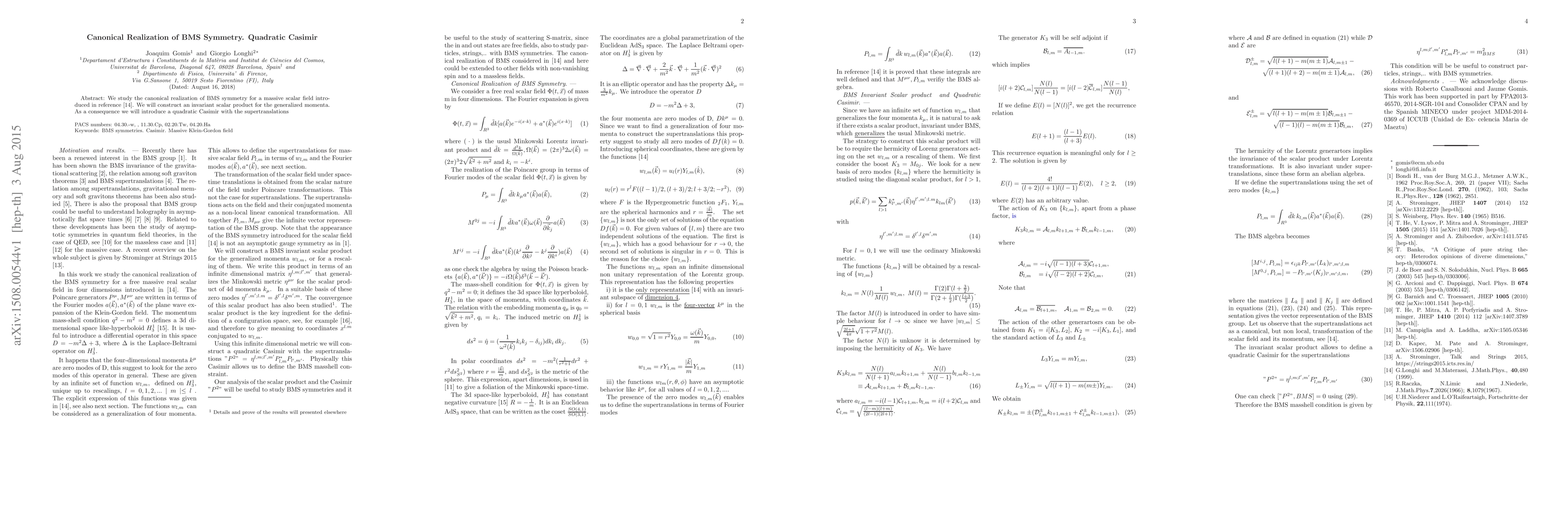 This paper explores the canonical realization of BMS (Bondi-Metzner-Sachs) symmetry in the context of a massive scalar field, constructing an invariant scalar product for the generalized momenta and introducing a quadratic Casimir operator associated with supertranslations.