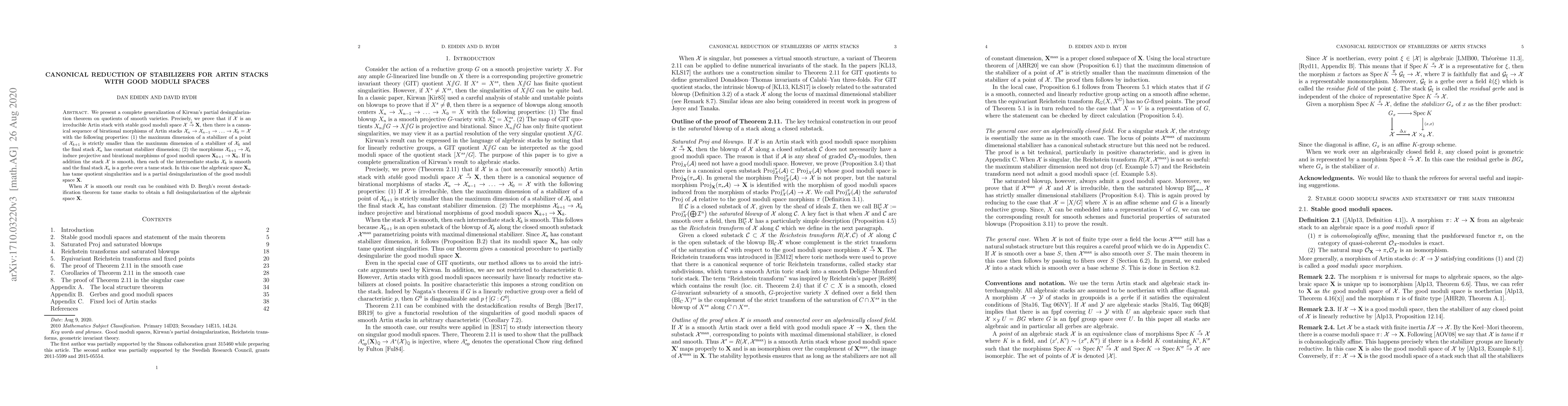 This paper generalizes Kirwan's theorem on desingularization of quotients, proving a canonical reduction sequence for irreducible Artin stacks with stable good moduli spaces, achieving constant stabilizer dimension and birational, projective transitions. For smooth stacks, the final stack is a gerbe over a tame stack with tame quotient singularities, and full desingularization is possible when combining with Bergh's theorem.