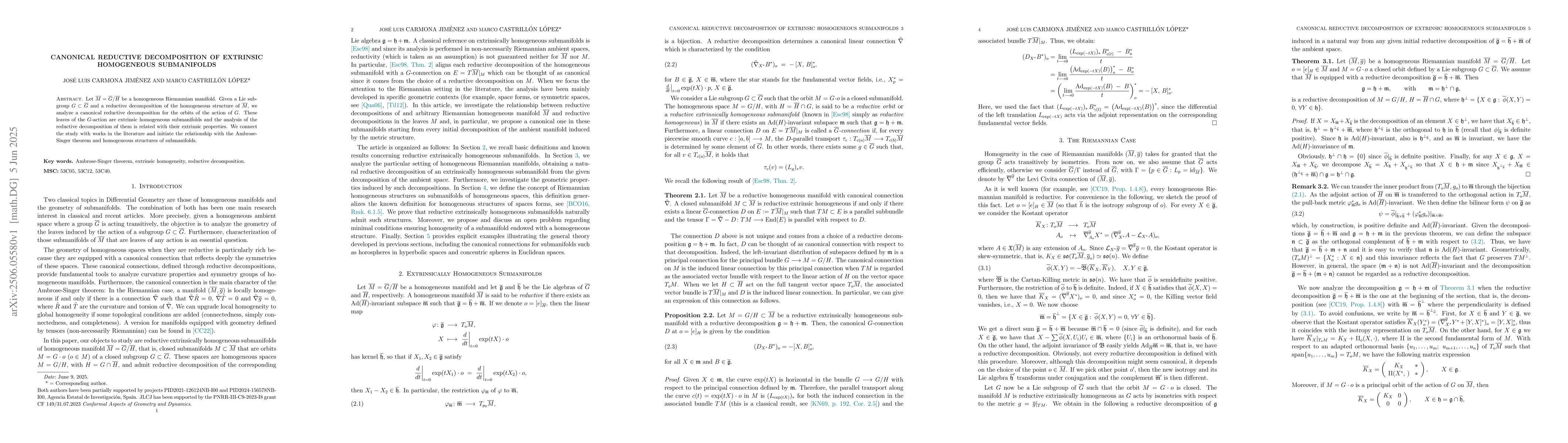 This paper explores a canonical reductive decomposition for orbits of a subgroup G's action on a homogeneous Riemannian manifold M, linking it to extrinsic properties of submanifolds. It connects with prior literature and initiates a relationship with the Ambrose-Singer theorem in the study of homogeneous submanifold structures.