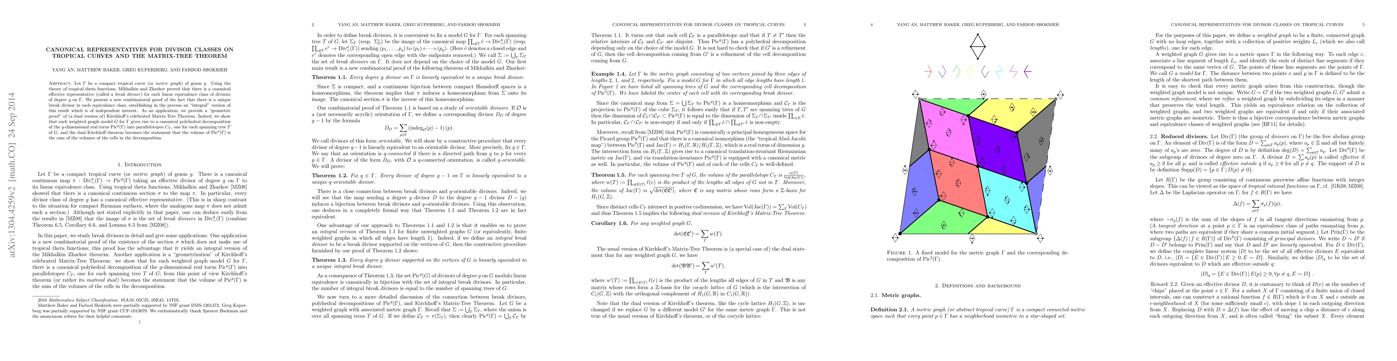 This paper presents a combinatorial proof for the uniqueness of canonical effective representatives (break divisors) for divisor classes on tropical curves, using tropical theta functions. It also provides a geometric proof of Kirchhoff's Matrix-Tree Theorem through a canonical polyhedral decomposition of the Picard group.