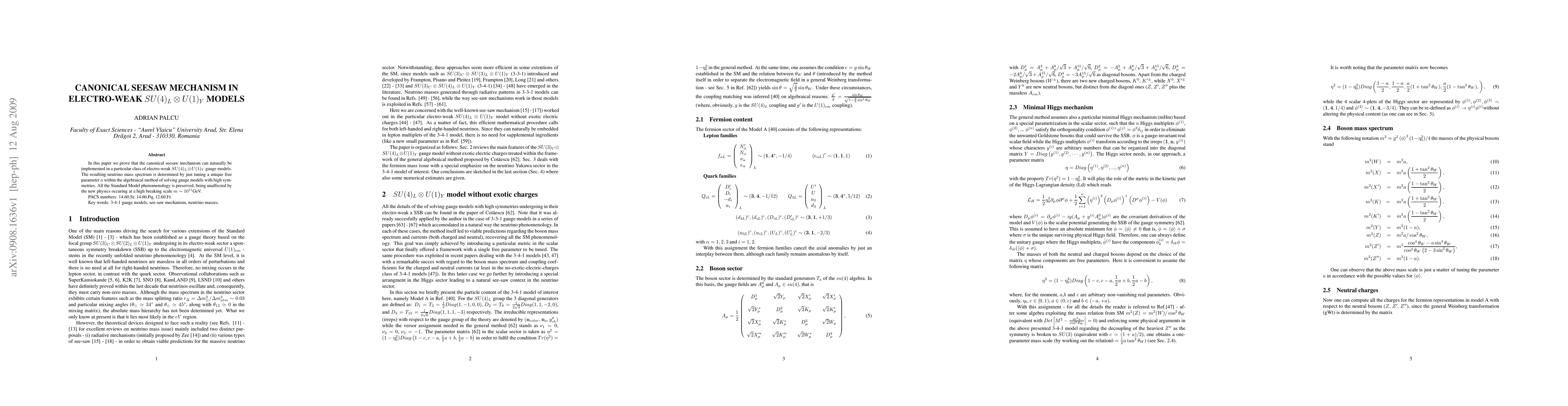 In this paper we prove that the canonical seesaw mechanism can naturally be implemented in a particular class of electro-weak SU(4)L x U(1)Y gauge models. The resulting neutrino mass spectrum is determined by just tuning a unique free parameter 'a' within the algebraical method of solving gauge models with high symmetries. All the Standard Model phenomenology is preserved, being unaffected by the new physics occuring at a high breaking scale m ~ 10^11GeV.