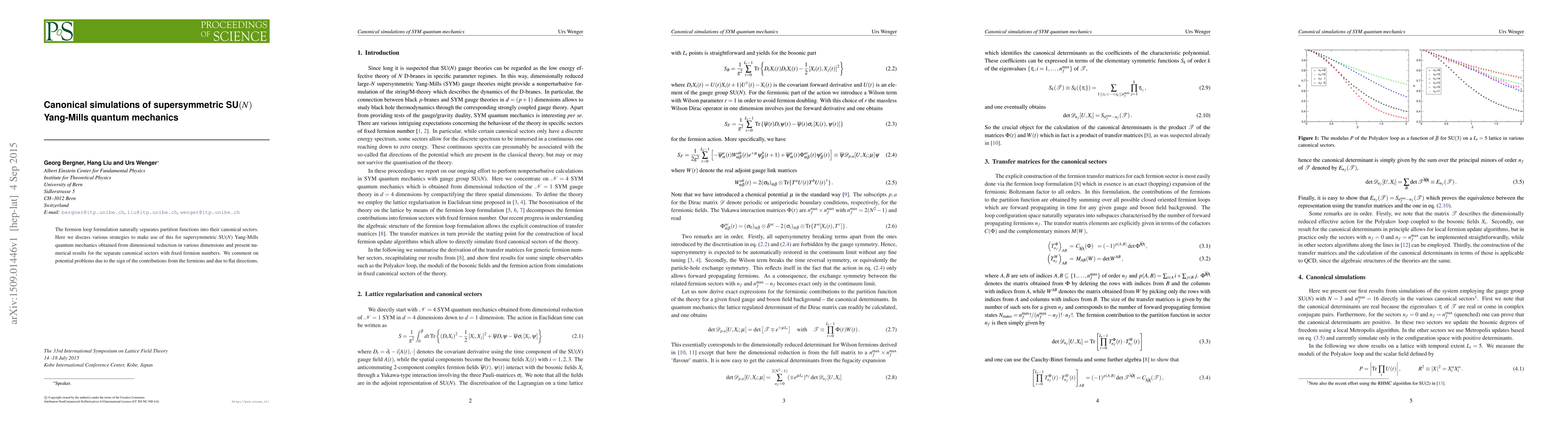 This paper explores canonical simulations of supersymmetric SU(N) Yang-Mills quantum mechanics, leveraging fermion loop formulations to separate partition functions into distinct canonical sectors. Numerical results are presented for these sectors, with discussions on challenges related to fermion contributions and flat directions.