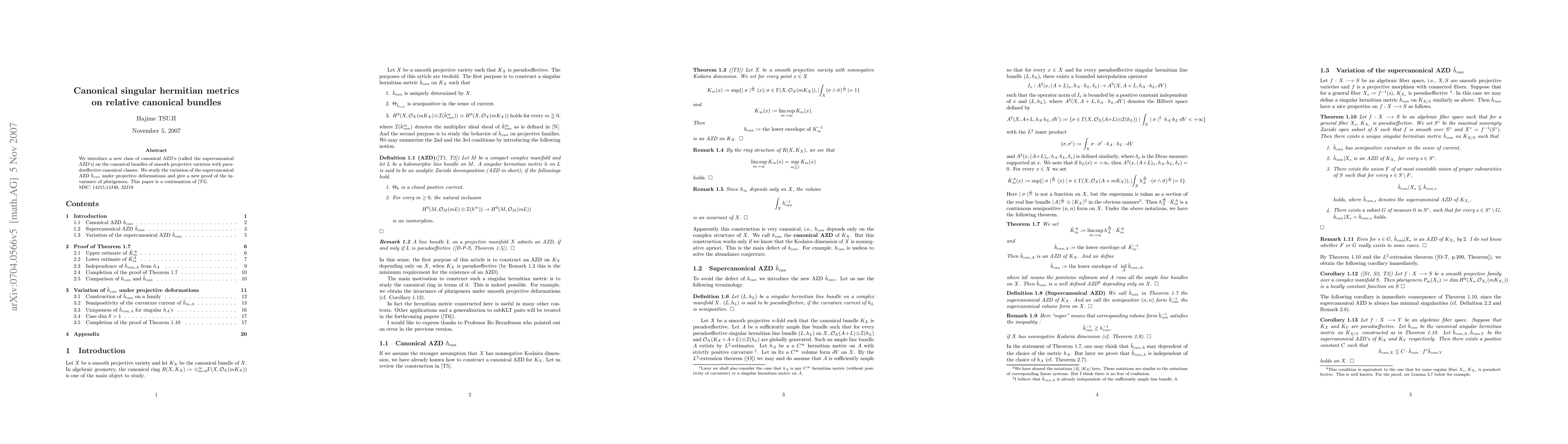 We introduce a new class of canonical AZD's (called the supercanonical AZD's) on the canonical bundles of smooth projective varieties with pseudoeffective canonical classes. We study the variation of the supercanonical AZD $\hat{h}_{can}$ under projective deformations and give a new proof of the invariance of plurigenera.