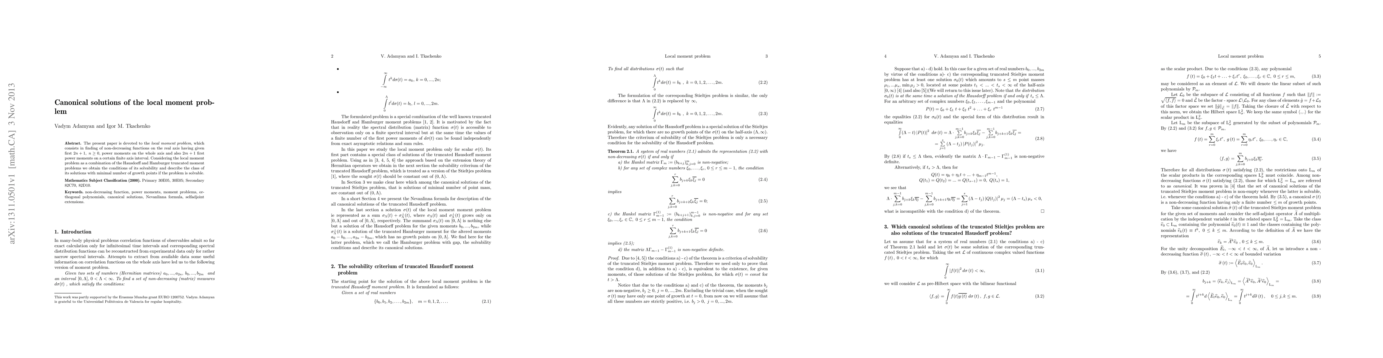 The present paper is devoted to the {\it local moment problem}, which consists in finding of non-decreasing functions on the real axis having given first $2n+1, \; n\geq 0,$ power moments on the whole axis and also $2m+1$ first power moments on a certain finite axis interval. Considering the local moment problem as a combination of the Hausdorff and Hamburger truncated moment problems we obtain the conditions of its solvability and describe the class of its solutions with minimal number of growth points if the problem is solvable.
