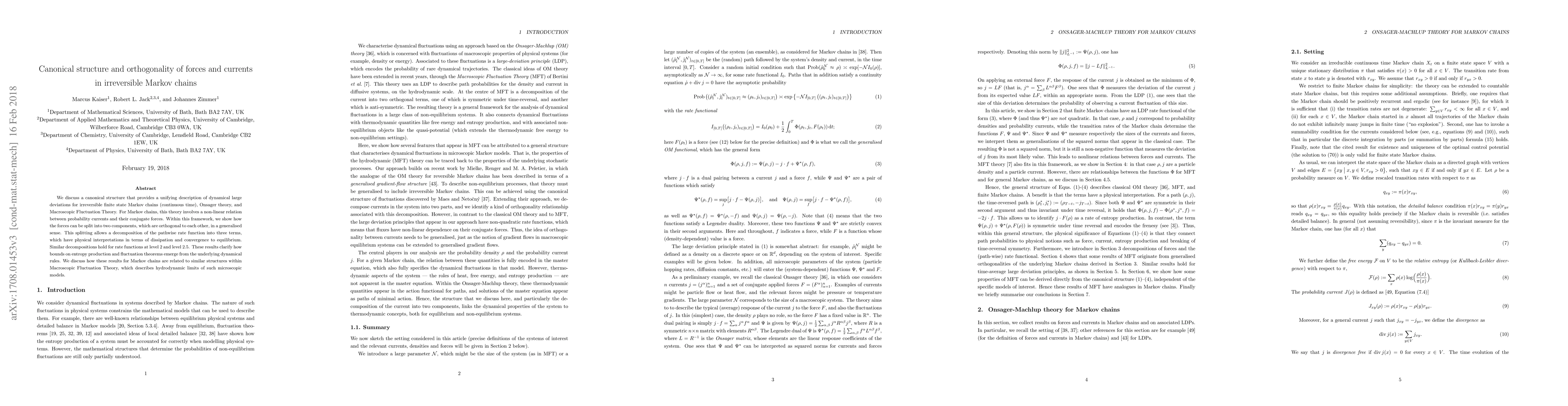 We discuss a canonical structure that provides a unifying description of dynamical large deviations for irreversible finite state Markov chains (continuous time), Onsager theory, and Macroscopic Fluctuation Theory. For Markov chains, this theory involves a non-linear relation between probability currents and their conjugate forces. Within this framework, we show how the forces can be split into two components, which are orthogonal to each other, in a generalised sense. This splitting allows a decomposition of the pathwise rate function into three terms, which have physical interpretations in terms of dissipation and convergence to equilibrium. Similar decompositions hold for rate functions at level 2 and level 2.5. These results clarify how bounds on entropy production and fluctuation theorems emerge from the underlying dynamical rules. We discuss how these results for Markov chains are related to similar structures within Macroscopic Fluctuation Theory, which describes hydrodynamic limits of such microscopic models.c Fluctuation Theory, which describes hydrodynamic limits of such microscopic models.