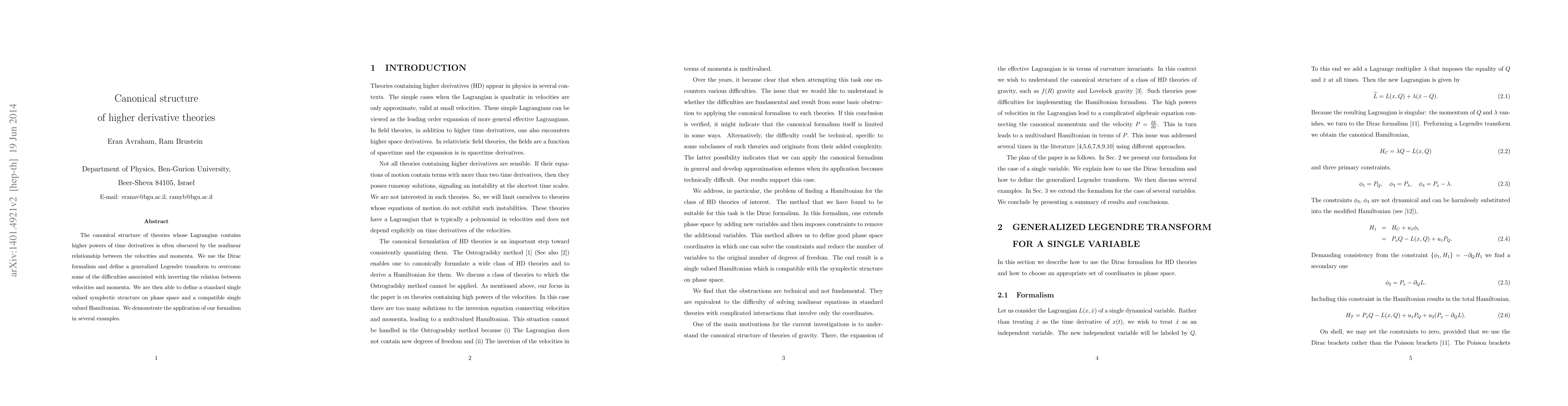 The canonical structure of theories whose Lagrangian contains higher powers of time derivatives is often obscured by the nonlinear relationship between the velocities and momenta. We use the Dirac formalism and define a generalized Legendre transform to overcome some of the difficulties associated with inverting the relation between velocities and momenta. We are then able to define a standard single valued symplectic structure on phase space and a compatible single valued Hamiltonian. We demonstrate the application of our formalism in several examples.