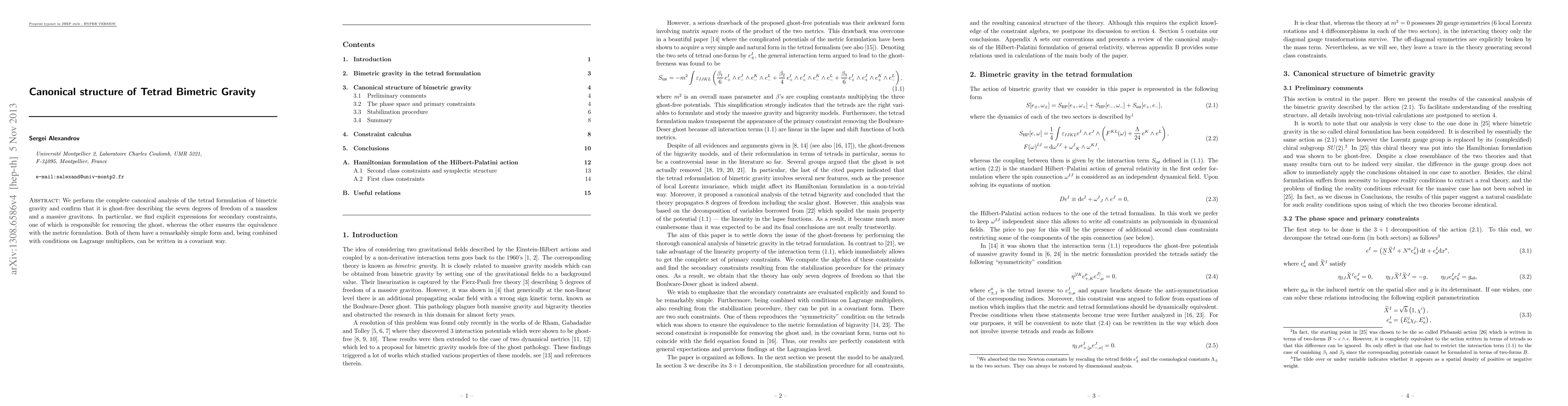 We perform the complete canonical analysis of the tetrad formulation of bimetric gravity and confirm that it is ghost-free describing the seven degrees of freedom of a massless and a massive gravitons. In particular, we find explicit expressions for secondary constraints, one of which is responsible for removing the ghost, whereas the other ensures the equivalence with the metric formulation. Both of them have a remarkably simple form and, being combined with conditions on Lagrange multipliers, can be written in a covariant way.