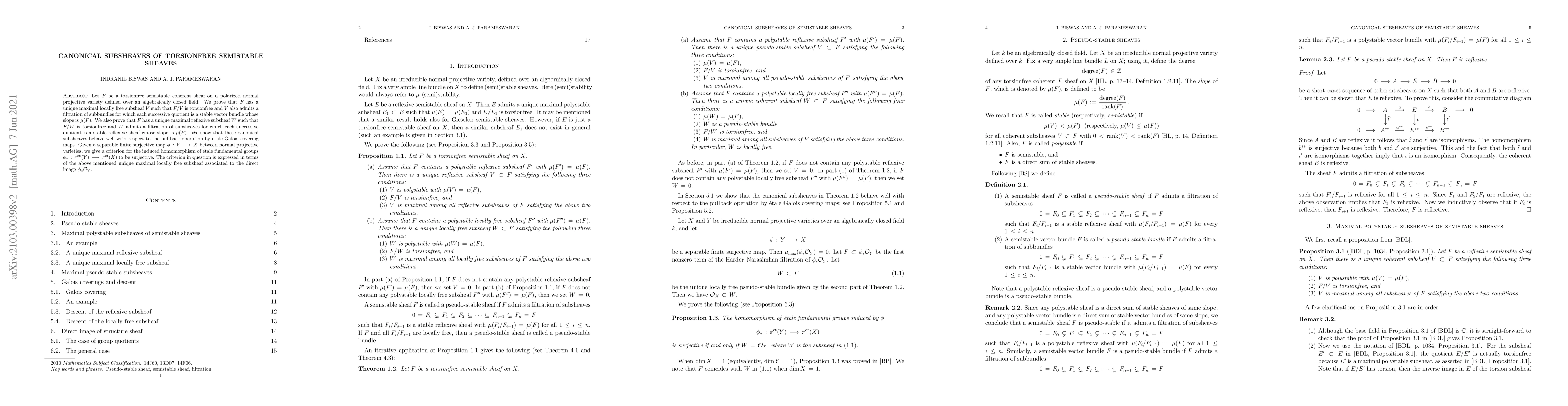 Let $F$ be a torsionfree semistable coherent sheaf on a polarized normal projective variety. We prove that $F$ has a unique maximal locally free subsheaf $V$ such that $F/V$ is torsionfree and $V$ admits a filtration of subbundles for which each successive quotient is stable whose slope is $\mu(F)$. We also prove that $F$ has a unique maximal reflexive subsheaf $W$ such that $F/W$ is torsionfree and $W$ admits a filtration of subsheaves for which each successive quotient is a stable reflexive sheaf whose slope is $\mu(F)$. We show that these canonical subsheaves behave well with respect to the pullback operation by \'etale Galois covering maps. Given a separable finite surjective map $\phi :Y \, \rightarrow X$ between normal projective varieties, we give a criterion for the induced homomorphism of \'etale fundamental groups $\phi_* : \pi^{\rm et}_{1}(Y) \rightarrow \pi^{\rm et}_{1}(X)$ to be surjective; this criterion is in terms of the above mentioned unique maximal locally free subsheaf associated to $\phi_*{\mathcal O}_Y$.
