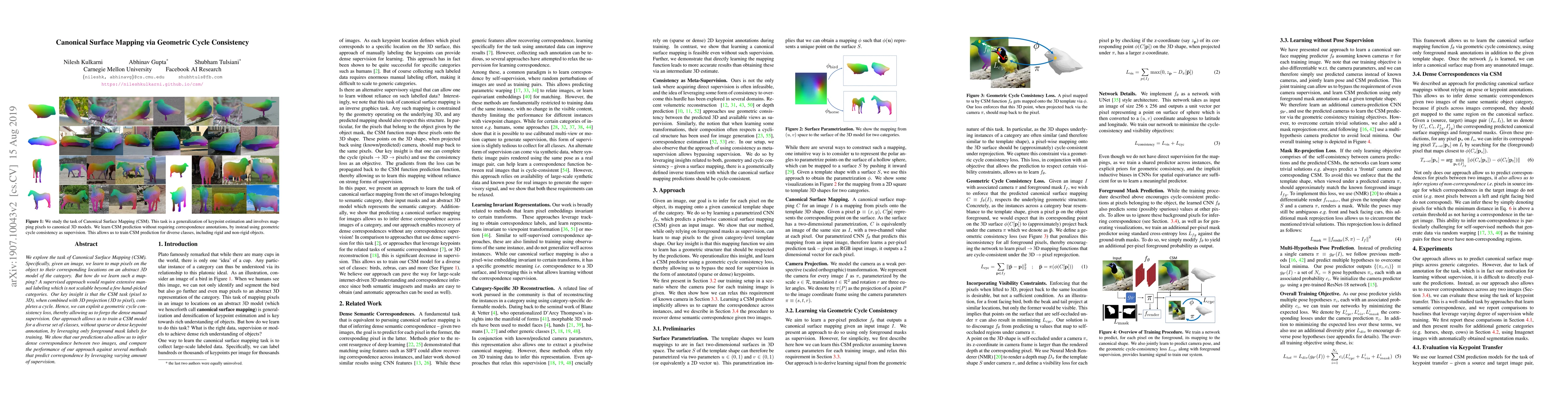We explore the task of Canonical Surface Mapping (CSM). Specifically, given an image, we learn to map pixels on the object to their corresponding locations on an abstract 3D model of the category. But how do we learn such a mapping? A supervised approach would require extensive manual labeling which is not scalable beyond a few hand-picked categories. Our key insight is that the CSM task (pixel to 3D), when combined with 3D projection (3D to pixel), completes a cycle. Hence, we can exploit a geometric cycle consistency loss, thereby allowing us to forgo the dense manual supervision. Our approach allows us to train a CSM model for a diverse set of classes, without sparse or dense keypoint annotation, by leveraging only foreground mask labels for training. We show that our predictions also allow us to infer dense correspondence between two images, and compare the performance of our approach against several methods that predict correspondence by leveraging varying amount of supervision.