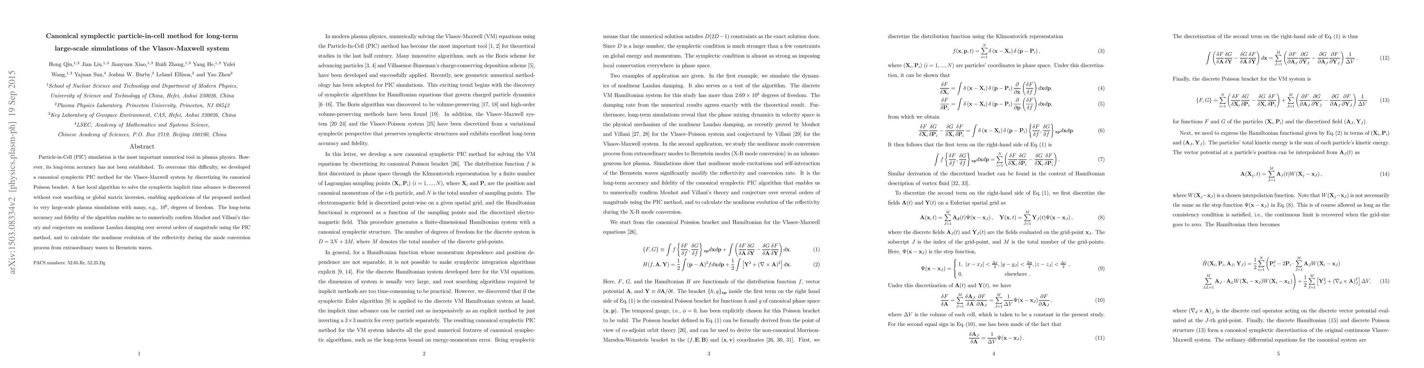 This paper introduces a canonical symplectic Particle-in-Cell (PIC) method for the Vlasov-Maxwell system, enhancing long-term accuracy in large-scale plasma simulations. The method employs a fast local algorithm for solving the symplectic implicit time advance, enabling simulations with up to $10^{9}$ degrees of freedom.