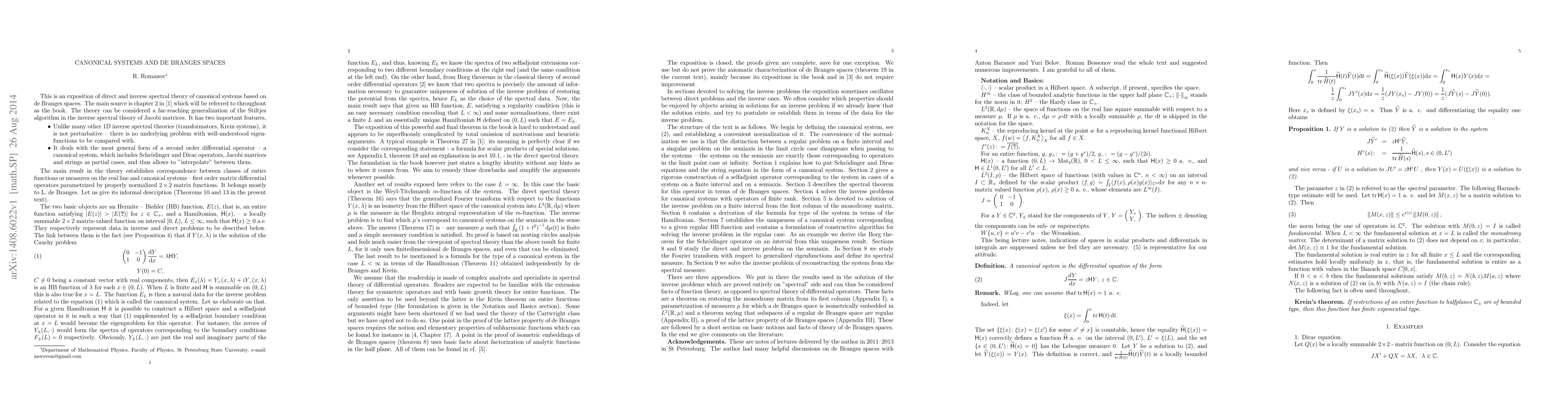 Summary: This paper explores the inverse spectral theory of canonical systems through the lens of de Branges spaces, focusing on entire functions and their canonical representations. It aims to elucidate the relationship between spectral properties and canonical systems within these function spaces.