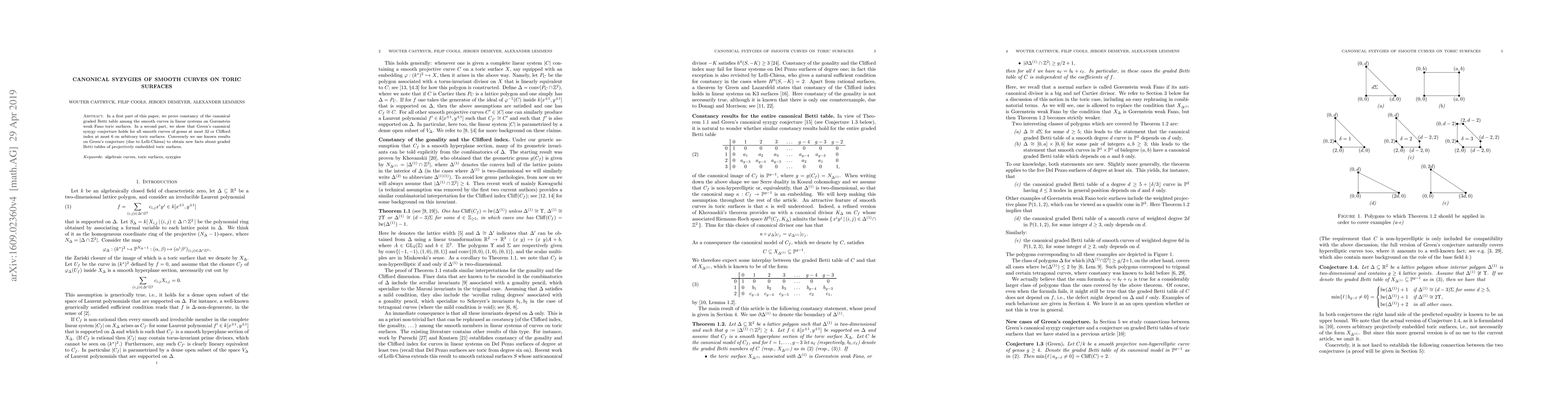 In a first part of this paper, we prove constancy of the canonical graded Betti table among the smooth curves in linear systems on Gorenstein weak Fano toric surfaces. In a second part, we show that Green's canonical syzygy conjecture holds for all smooth curves of genus at most 32 or Clifford index at most 6 on arbitrary toric surfaces. Conversely we use known results on Green's conjecture (due to Lelli-Chiesa) to obtain new facts about graded Betti tables of projectively embedded toric surfaces.