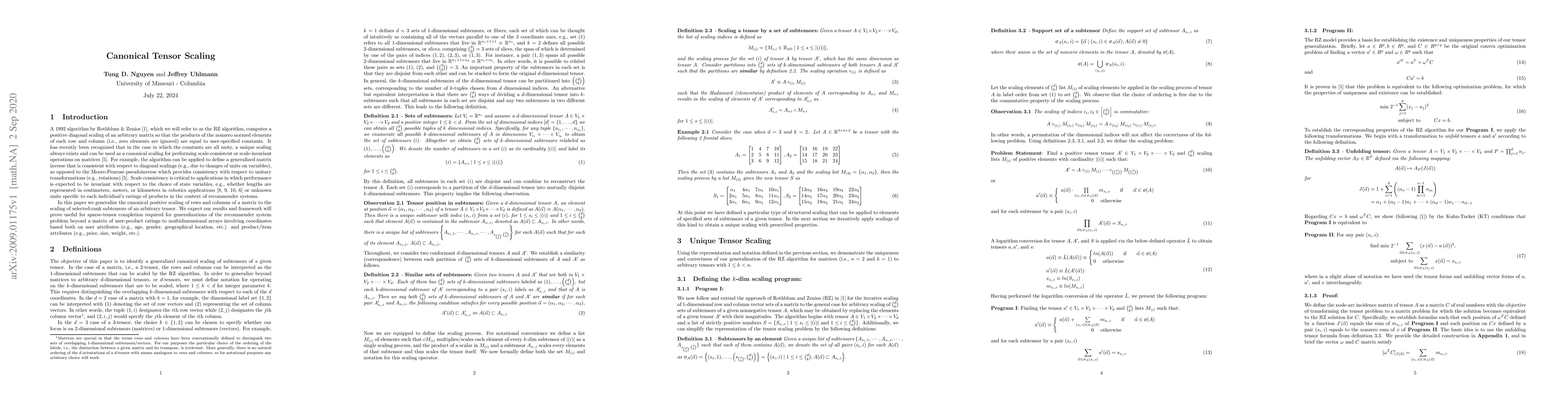 In this paper we generalize the canonical positive scaling of rows and columns of a matrix to the scaling of selected-rank subtensors of an arbitrary tensor. We expect our results and framework will prove useful for sparse-tensor completion required for generalizations of the recommender system problem beyond a matrix of user-product ratings to multidimensional arrays involving coordinates based both on user attributes (e.g., age, gender, geographical location, etc.) and product/item attributes (e.g., price, size, weight, etc.).