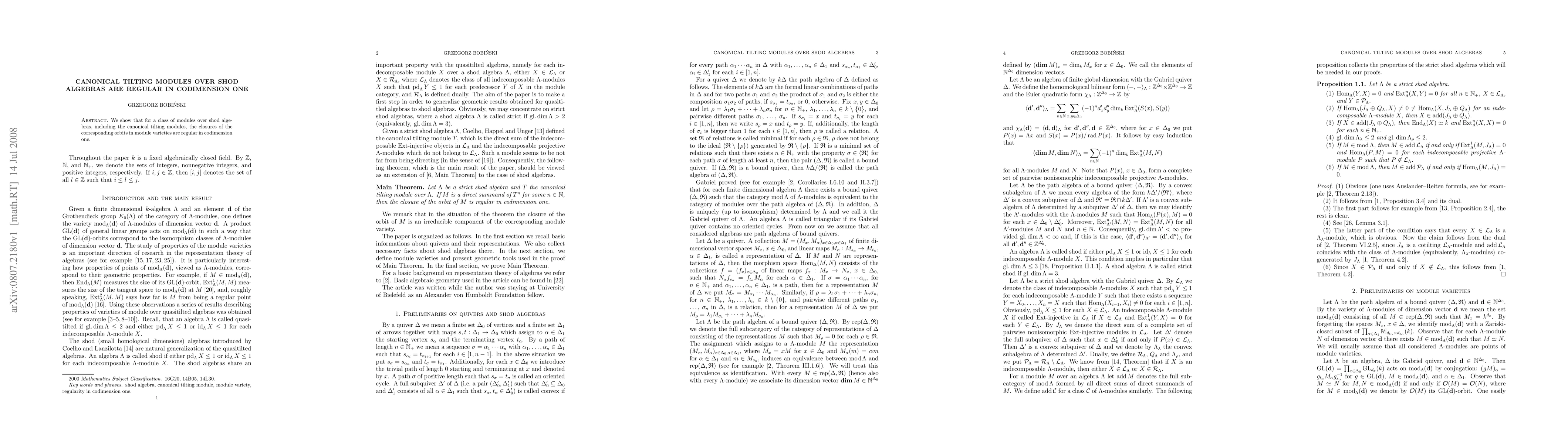 Summary: This paper demonstrates that canonical tilting modules over shod algebras have orbits whose closures in module varieties are regular in codimension one, establishing a structural regularity in these algebraic contexts.