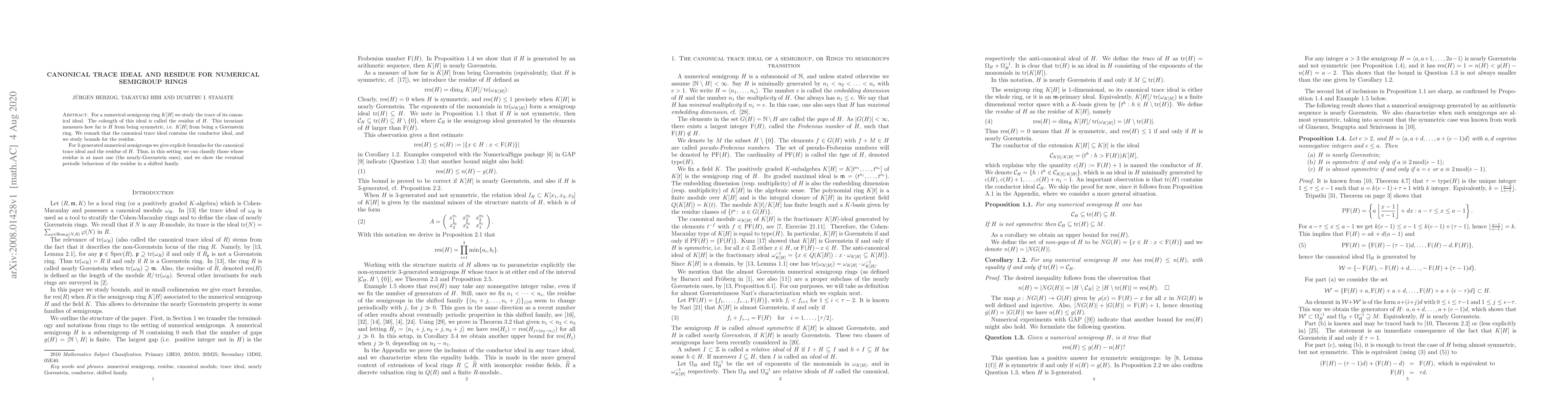 This paper investigates the canonical trace ideal and residue in numerical semigroup rings $K[H]$ to measure their deviation from being symmetric (Gorenstein). It provides explicit formulas for $3$-generated semigroups, classifying nearly-Gorenstein ones and demonstrating periodic behavior of the residue in a shifted family.
