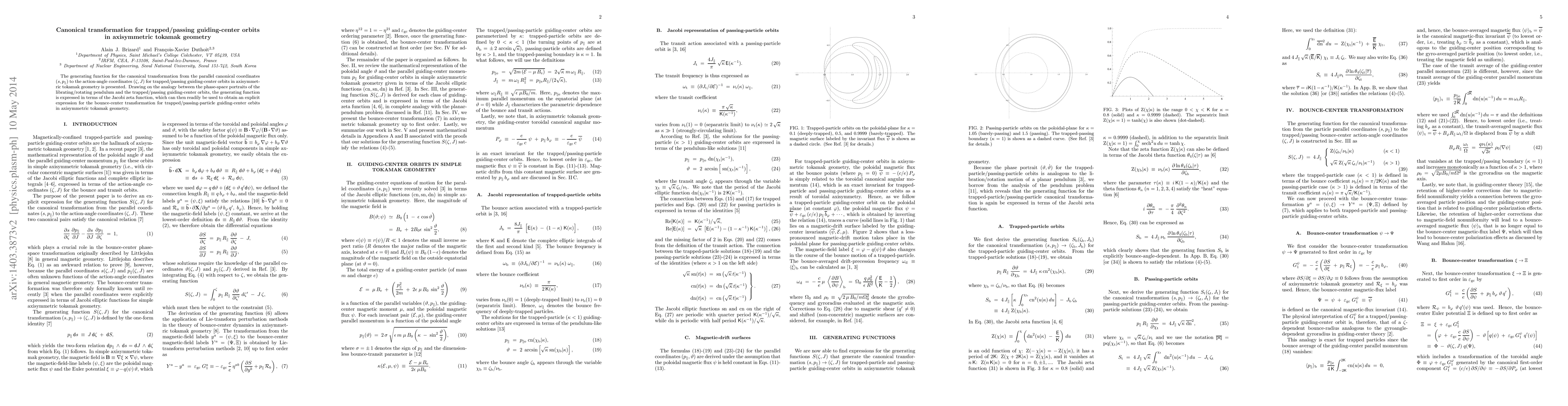 This paper presents a generating function for a canonical transformation that converts parallel canonical coordinates to action-angle coordinates for trapped/passing guiding-center orbits in axisymmetric tokamak geometry. It utilizes the Jacobi zeta function, drawing parallels with the pendulum's phase-space behavior, to derive an explicit bounce-center transformation.