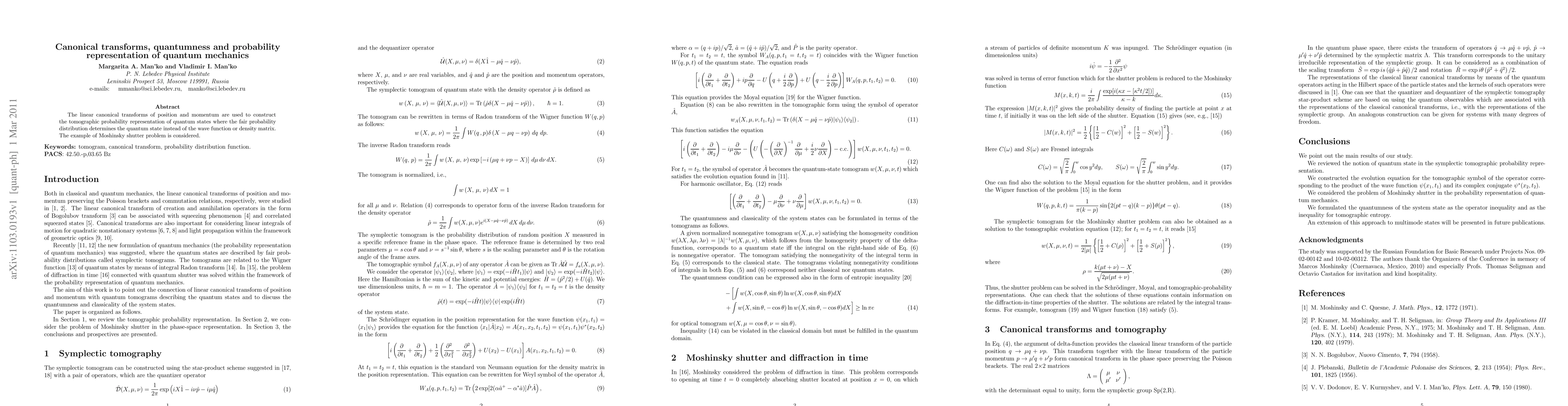 Summary: This paper uses linear canonical transforms to develop a tomographic probability representation of quantum states, where probability distributions replace wave functions or density matrices, and applies this to the Moshinsky shutter problem.