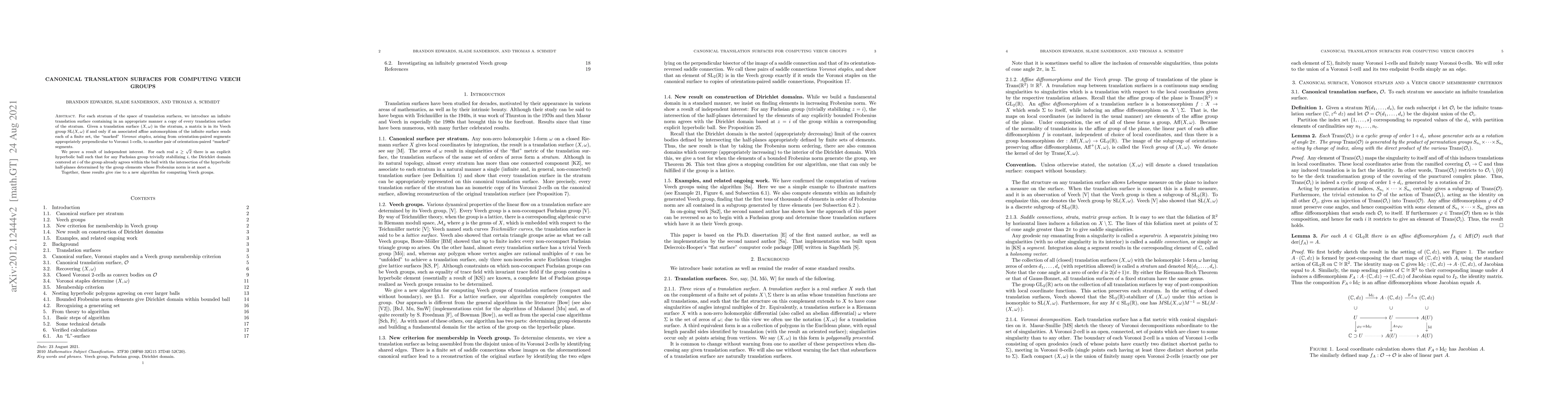 For each stratum of the space of translation surfaces, we introduce an infinite translation surface containing in an appropriate manner a copy of every translation surface of the stratum. Given a translation surface $(X, \omega)$ in the stratum, a matrix is in its Veech group $\mathrm{SL}(X,\omega)$ if and only if an associated affine automorphism of the infinite surface sends each of a finite set, the ``marked" {\em Voronoi staples}, arising from orientation-paired segments appropriately perpendicular to Voronoi 1-cells, to another pair of orientation-paired ``marked" segments. We prove a result of independent interest. For each real $a\ge \sqrt{2}$ there is an explicit hyperbolic ball such that for any Fuchsian group trivially stabilizing $i$, the Dirichlet domain centered at $i$ of the group already agrees within the ball with the intersection of the hyperbolic half-planes determined by the group elements whose Frobenius norm is at most $a$. %When $\mathrm{SL}(X,\omega)$ is a lattice we use this to give a condition guaranteeing that the full group $\mathrm{SL}(X,\omega)$ has been computed. Together, these results give rise to a new algorithm for computing Veech groups.