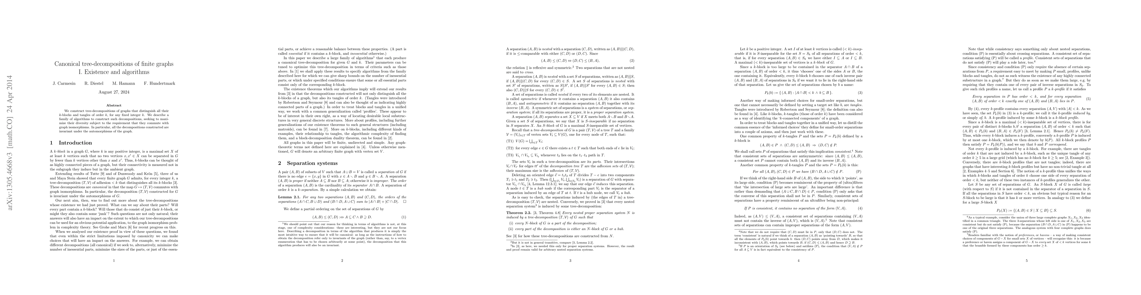This paper presents algorithms for constructing canonical tree-decompositions of finite graphs that uniquely identify all k-blocks and k-tangles for any fixed k. The proposed decompositions are invariant under graph automorphisms and maximize diversity while maintaining commutativity with graph isomorphisms.
