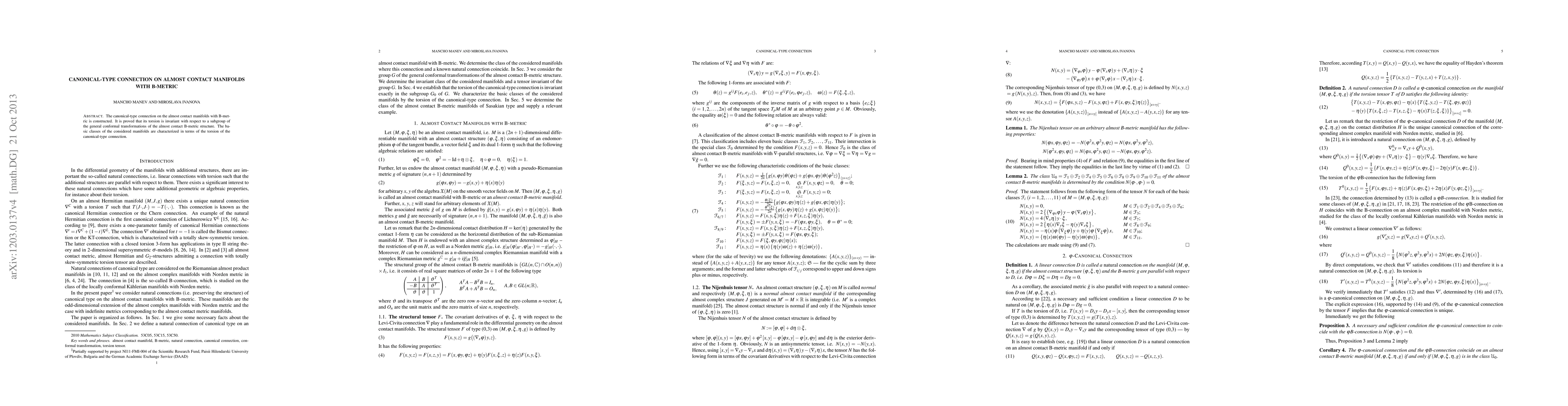 This paper constructs a canonical-type connection on almost contact manifolds equipped with a B-metric, proving that its torsion remains invariant under a subgroup of conformal transformations. The study characterizes fundamental classes of these manifolds based on the torsion of the connection.