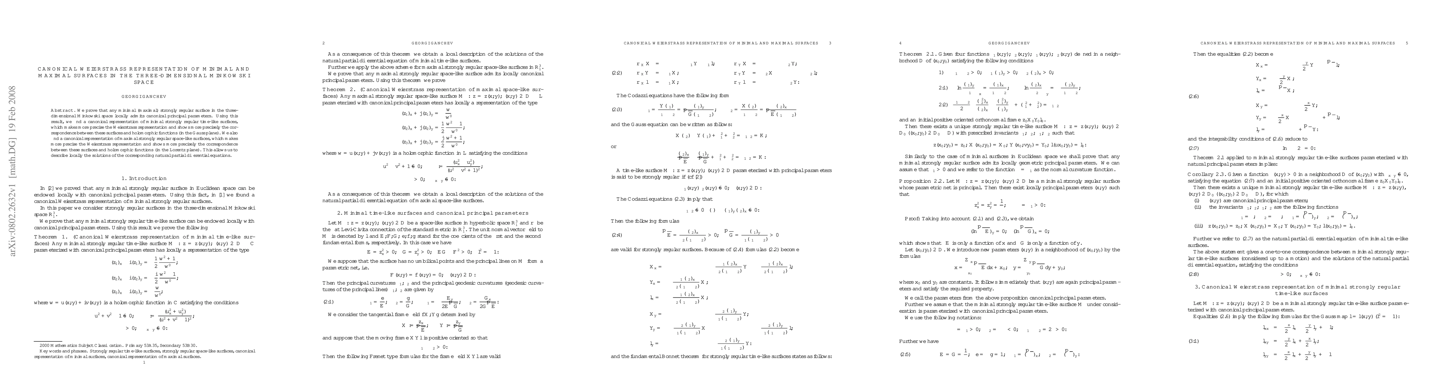 This paper establishes canonical Weierstrass representations for minimal and maximal strongly regular surfaces in three-dimensional Minkowski space, revealing local principal parameters and precise correspondences between these surfaces and holomorphic functions in respective planes, aiding in the description of solutions to natural partial differential equations.
