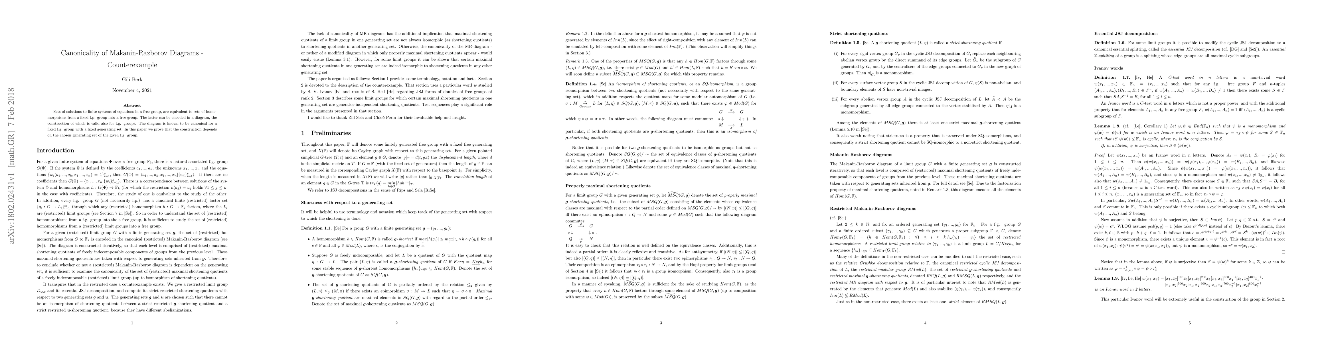 Sets of solutions to finite systems of equations in a free group, are equivalent to sets of homomorphisms from a fixed f.p. group into a free group. The latter can be encoded in a diagram, the construction of which is valid also for f.g. groups. The diagram is known to be canonical for a fixed f.g. group with a fixed generating set. In this paper we prove that the construction depends on the chosen generating set of the given f.g. group.