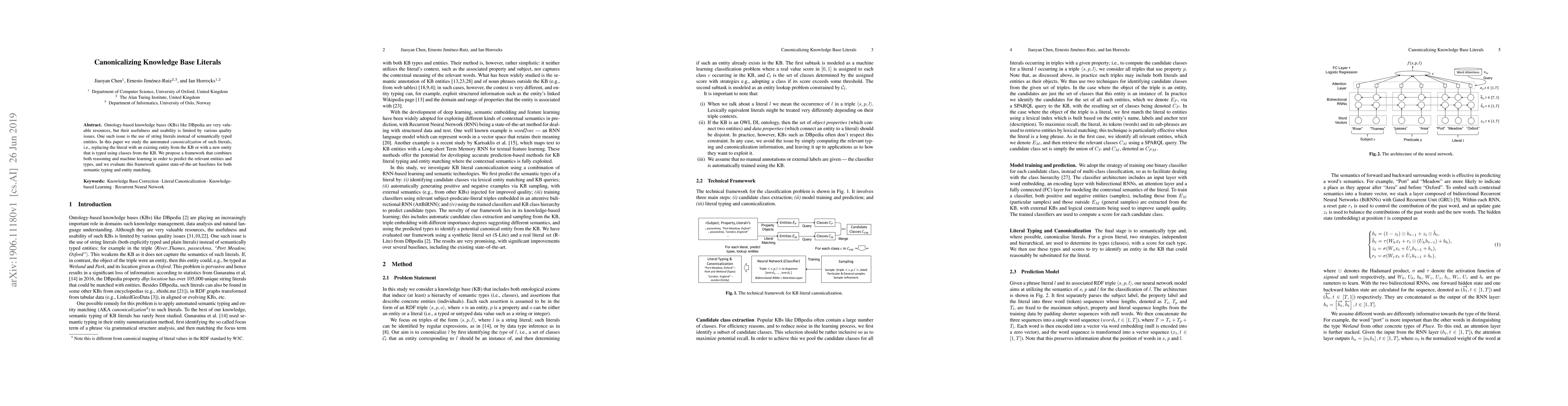 This paper proposes a framework for the automated canonicalization of literals in ontology-based knowledge bases, combining reasoning and machine learning to predict relevant entities and types, and evaluates its performance against current state-of-the-art methods. The goal is to improve the quality and usability of knowledge bases by replacing string literals with semantically typed entities.