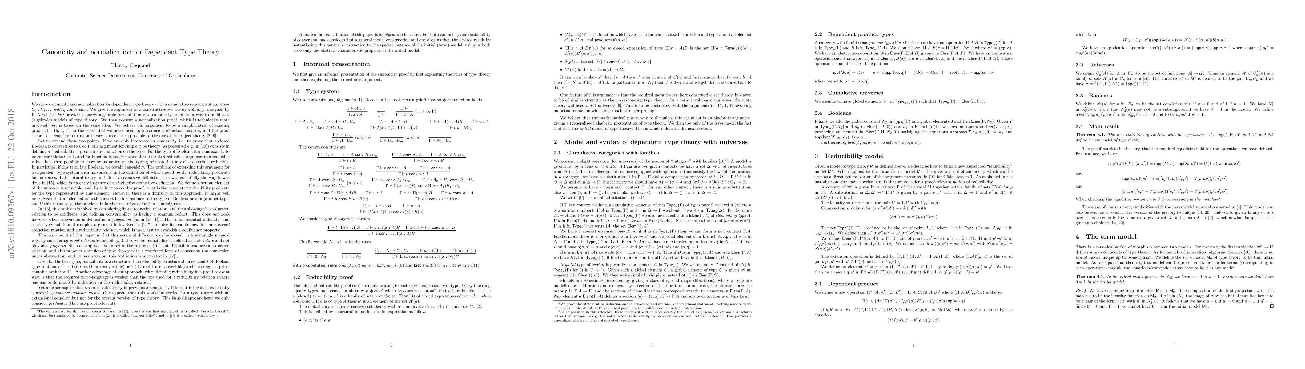 The paper presents a proof of canonicity and normalization for dependent type theory with cumulative universes and Boolean, using a reducibility model with a proof-relevant notion of reducibility, and a normalization model that reflects the method of reducibility used for normalization.