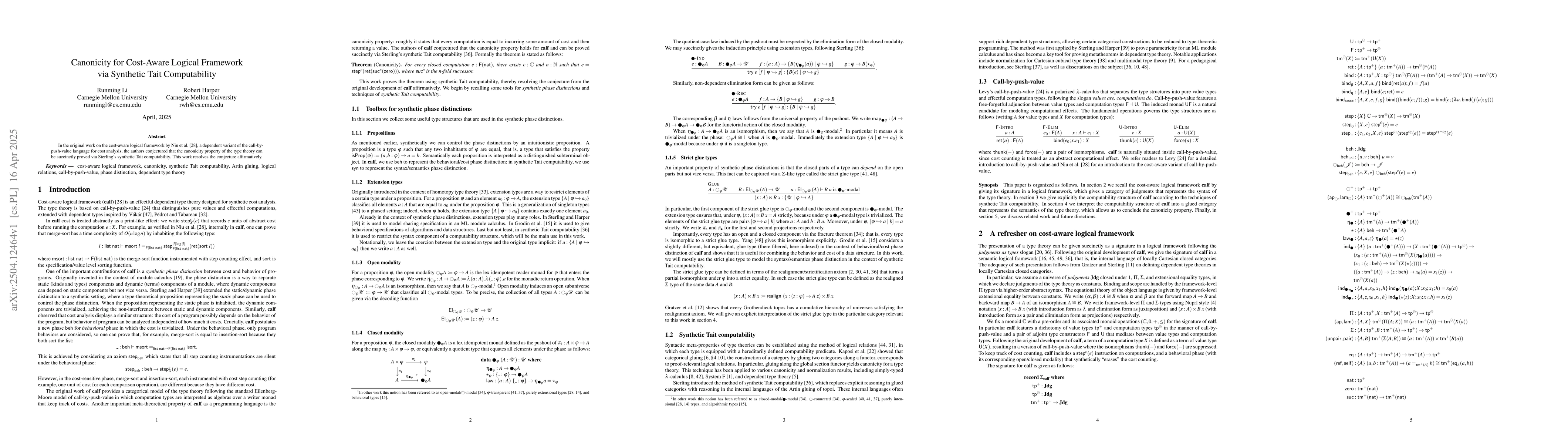 A research paper confirms that canonicity in a cost-aware logical framework can be proven using synthetic Tait computability, resolving an open conjecture made in an earlier work.