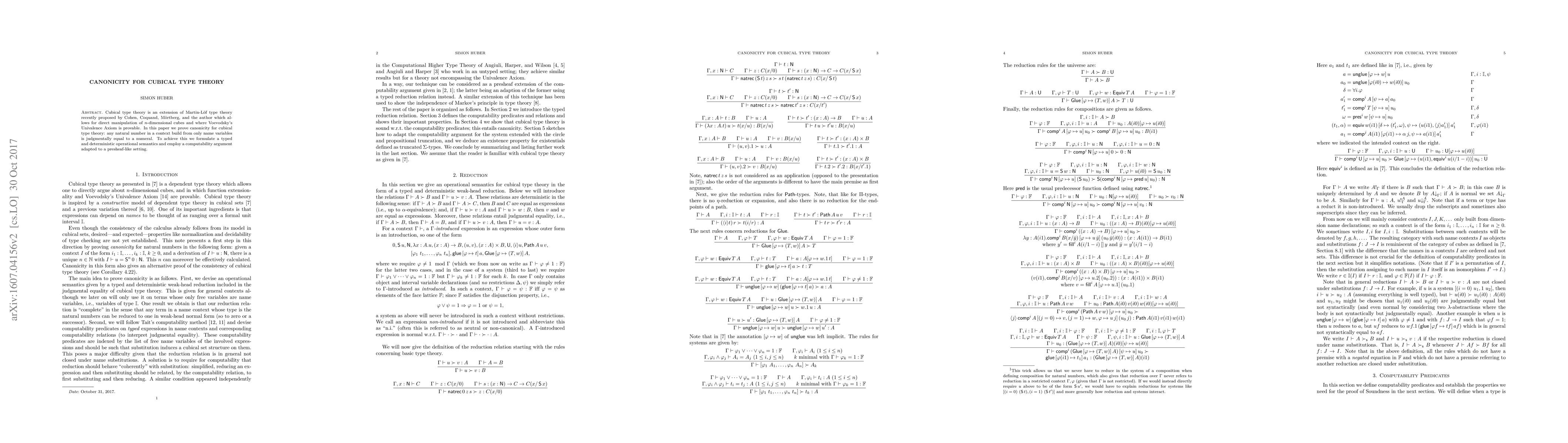 This paper proves canonicity in cubical type theory, showing that any natural number constructed from name variables is judgmentally equal to a numeral, by establishing a typed and deterministic operational semantics and using a computability argument tailored to a presheaf-like framework.