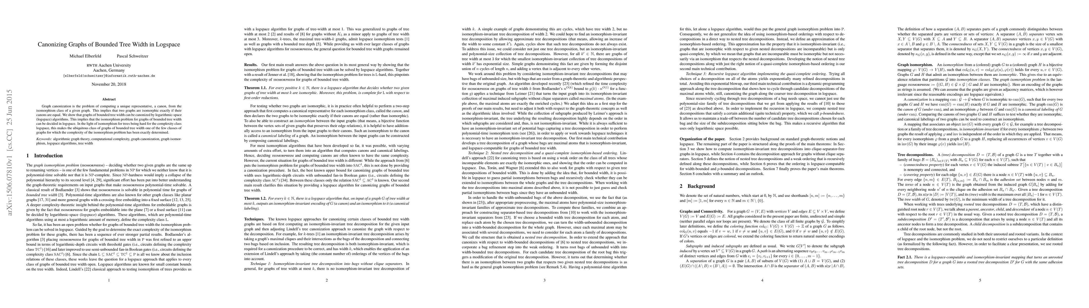 This paper demonstrates that graphs with bounded tree width can be canonized using logarithmic-space algorithms, implying that the isomorphism problem for such graphs can be solved in logspace, a significant result given that tree isomorphism is hard for logspace.