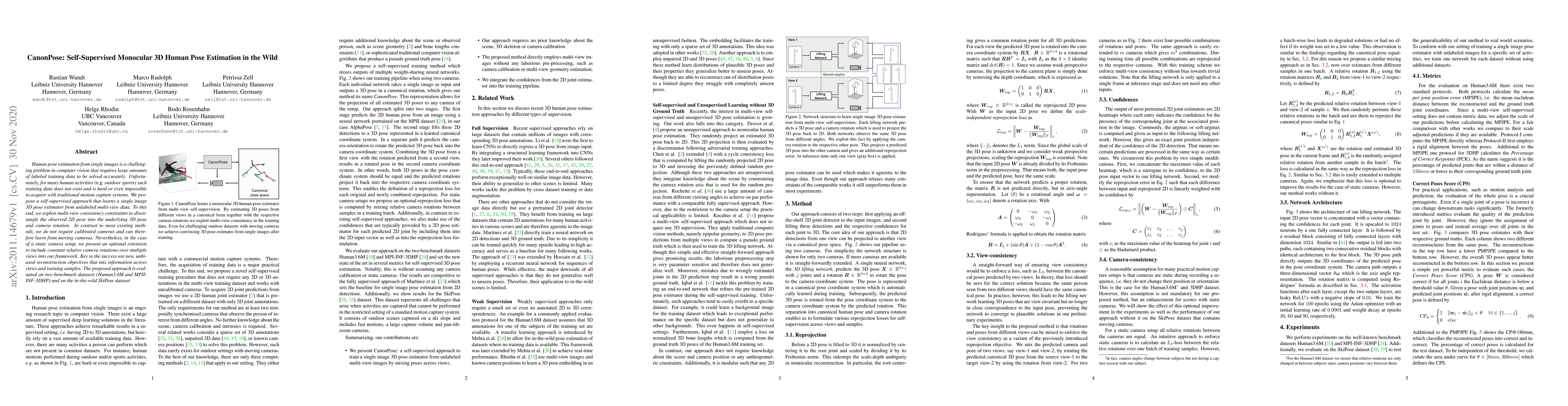 This paper introduces CanonPose, a self-supervised method for estimating 3D human poses from single images using unlabeled multi-view data. It leverages multi-view consistency to disentangle 2D poses into 3D poses and camera rotations without requiring calibrated cameras, thus enabling learning from moving cameras.
