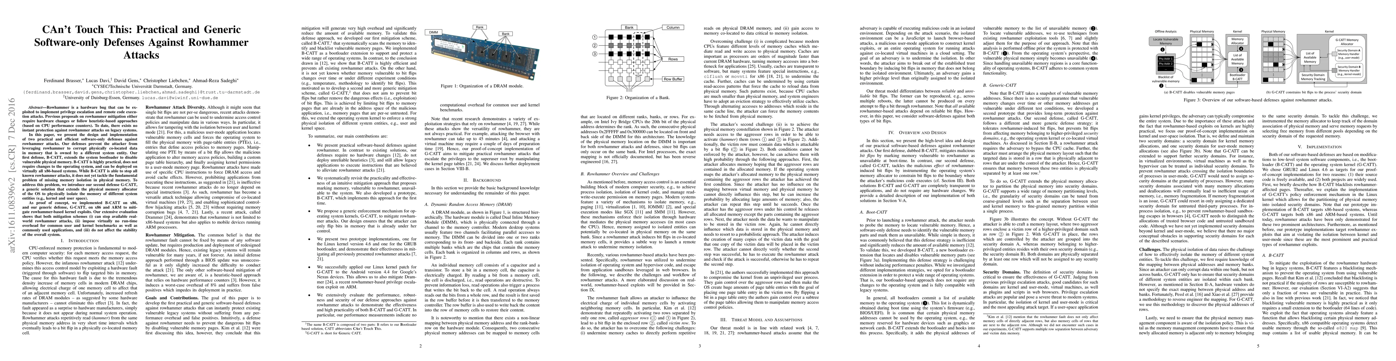 This paper introduces two software-only defenses, B-CATT and G-CATT, to mitigate Rowhammer attacks without requiring hardware changes. B-CATT disables vulnerable memory at boot, while G-CATT physically isolates memory for different system entities, effectively stopping all known attacks with minimal performance overhead.
