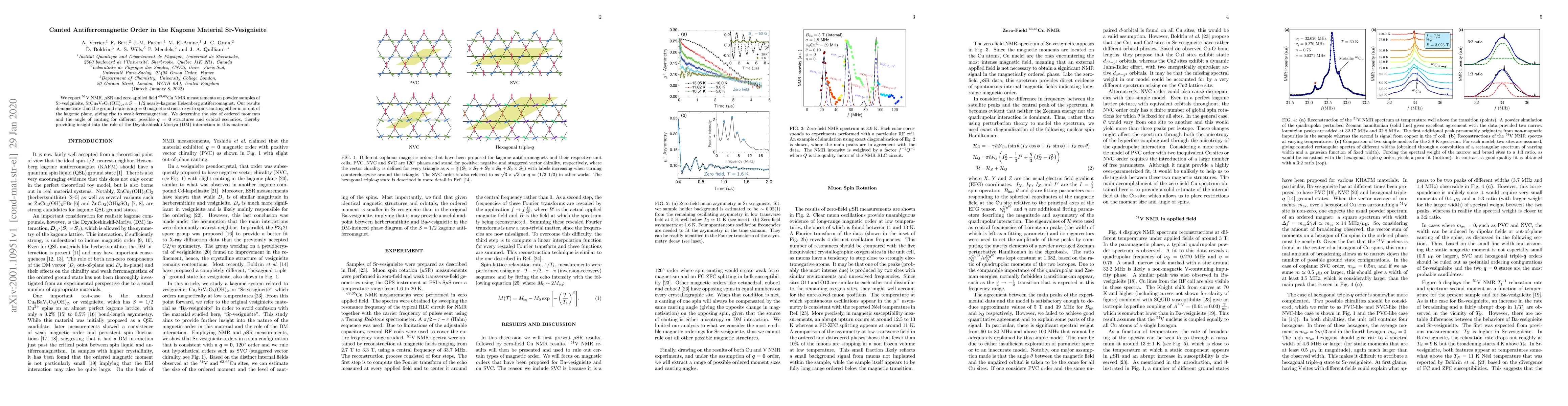 We report $^{51}$V NMR, $\mu$SR and zero applied field $^{63,65}$Cu NMR measurements on powder samples of Sr-vesignieite, SrCu$_3$V$_2$O$_8$(OH)$_2$, a $S = 1/2$ nearly-kagome Heisenberg antiferromagnet. Our results demonstrate that the ground state is a $\mathbf{q} = 0$ magnetic structure with spins canting either in or out of the kagome plane, giving rise to weak ferromagnetism. We determine the size of ordered moments and the angle of canting for different possible $\mathbf{q} = 0$ structures and orbital scenarios, thereby providing insight into the role of the Dzyaloshinskii-Moriya (DM) interaction in this material.