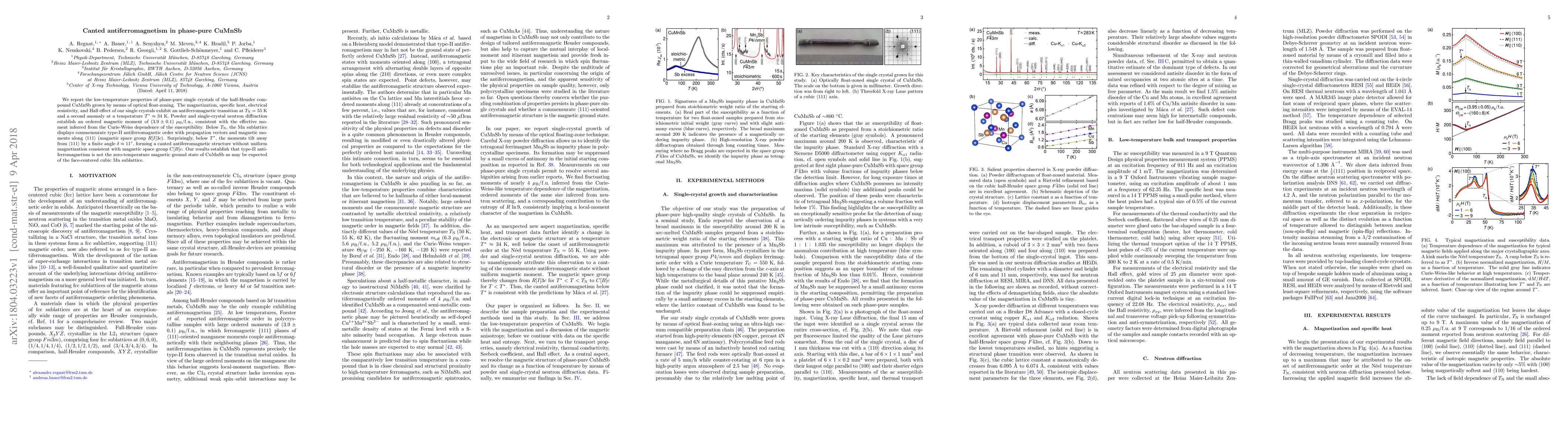 We report the low-temperature properties of phase-pure single crystals of the half-Heusler compound CuMnSb grown by means of optical float-zoning. The magnetization, specific heat, electrical resistivity, and Hall effect of our single crystals exhibit an antiferromagnetic transition at $T_{\mathrm{N}} = 55~\mathrm{K}$ and a second anomaly at a temperature $T^{*} \approx 34~\mathrm{K}$. Powder and single-crystal neutron diffraction establish an ordered magnetic moment of $(3.9\pm0.1)~\mu_{\mathrm{B}}/\mathrm{f.u.}$, consistent with the effective moment inferred from the Curie-Weiss dependence of the susceptibility. Below $T_{\mathrm{N}}$, the Mn sublattice displays commensurate type-II antiferromagnetic order with propagation vectors and magnetic moments along $\langle111\rangle$ (magnetic space group $R[I]3c$). Surprisingly, below $T^{*}$, the moments tilt away from $\langle111\rangle$ by a finite angle $\delta \approx 11^{\circ}$, forming a canted antiferromagnetic structure without uniform magnetization consistent with magnetic space group $C[B]c$. Our results establish that type-II antiferromagnetism is not the zero-temperature magnetic ground state of CuMnSb as may be expected of the face-centered cubic Mn sublattice.