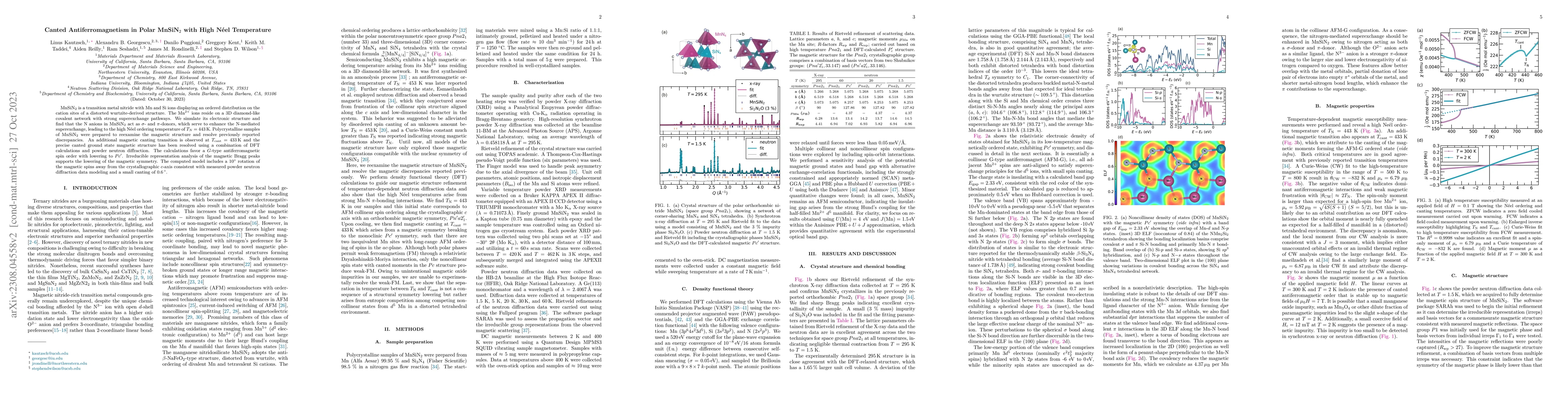 MnSiN$_2$ exhibits a high N\'eel temperature of 443 K due to enhanced N-mediated superexchange. A canted antiferromagnetic transition occurs at 433 K, with a $G$-type spin order lowering to $Pc^\prime$, confirmed by DFT calculations and neutron diffraction.