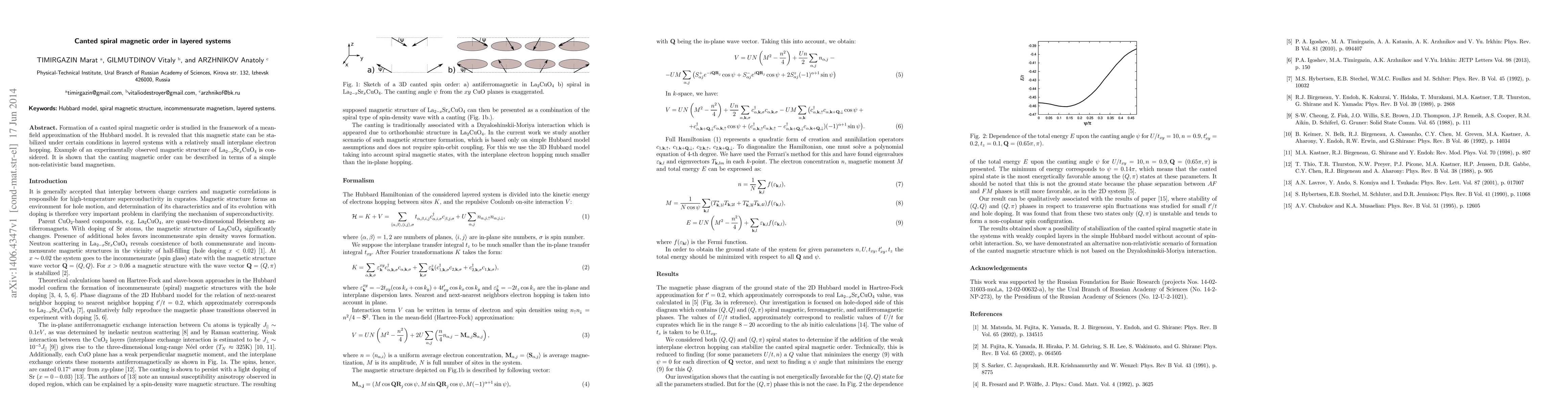 The research uses a mean-field approximation of the Hubbard model to demonstrate that a canted spiral magnetic order can emerge in layered systems with minor interplane electron hopping. This theory successfully explains the magnetic structure observed in La2-xSrxCuO4, suggesting it can be described by simple non-relativistic band magnetism.
