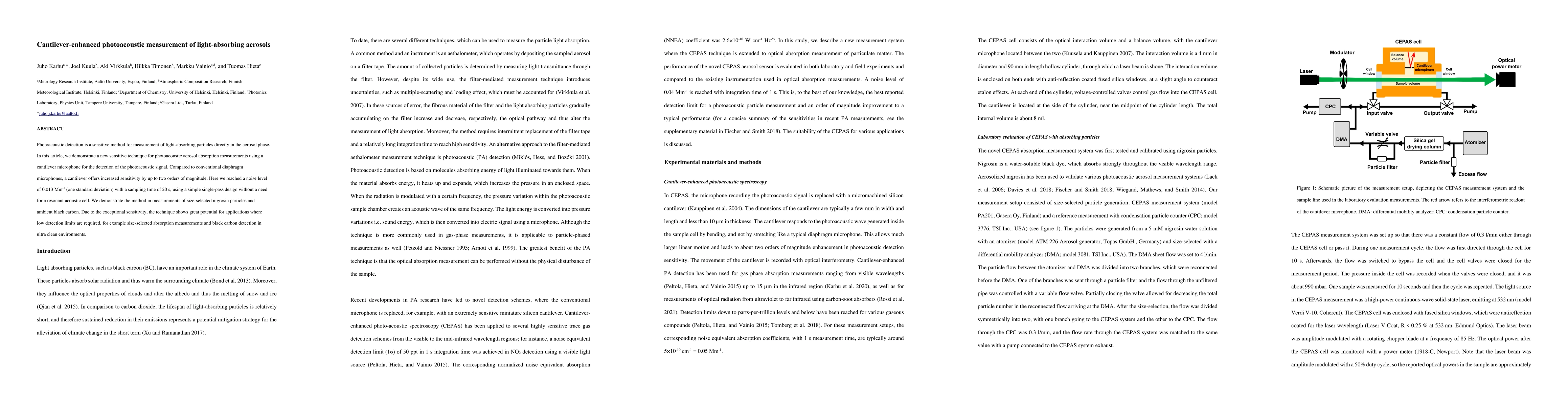 Photoacoustic detection is a sensitive method for measurement of light-absorbing particles directly in the aerosol phase. In this article, we demonstrate a new sensitive technique for photoacoustic aerosol absorption measurements using a cantilever microphone for the detection of the photoacoustic signal. Compared to conventional diaphragm microphones, a cantilever offers increased sensitivity by up to two orders of magnitude. Here we reached a noise level of 0.013 Mm$^{-1}$ (one standard deviation) with a sampling time of 20 s, using a simple single-pass design without a need for a resonant acoustic cell. We demonstrate the method in measurements of size-selected nigrosin particles and ambient black carbon. Due to the exceptional sensitivity, the technique shows great potential for applications where low detection limits are required, for example size-selected absorption measurements and black carbon detection in ultra clean environments.