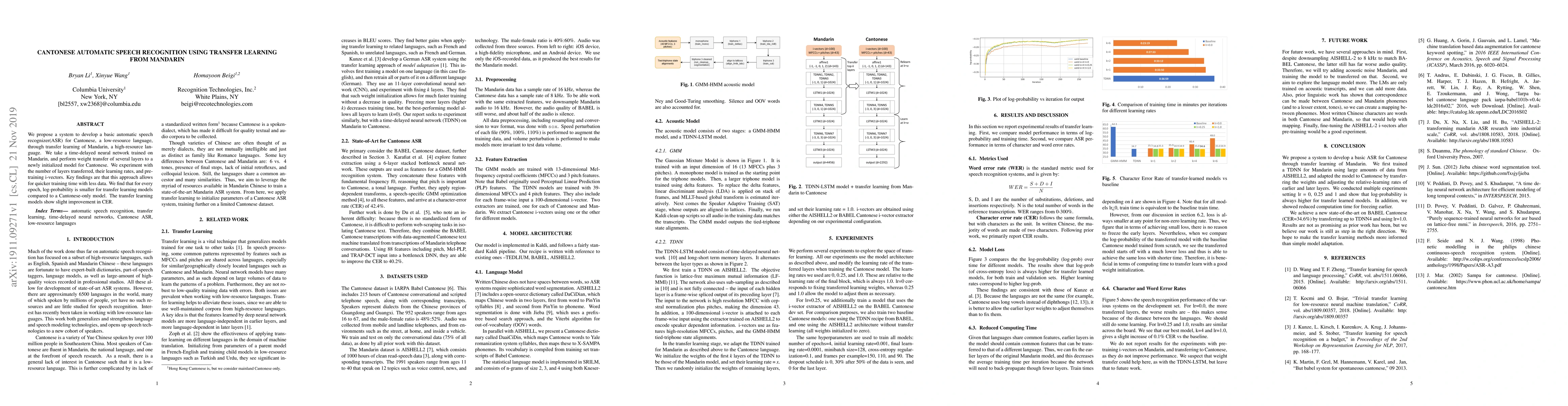This paper proposes a transfer learning approach to develop an automatic speech recognizer for Cantonese using a Mandarin-trained neural network. The study finds that transfer learning significantly reduces training time and data requirements, with slight improvements in character error rate compared to a Cantonese-only model.