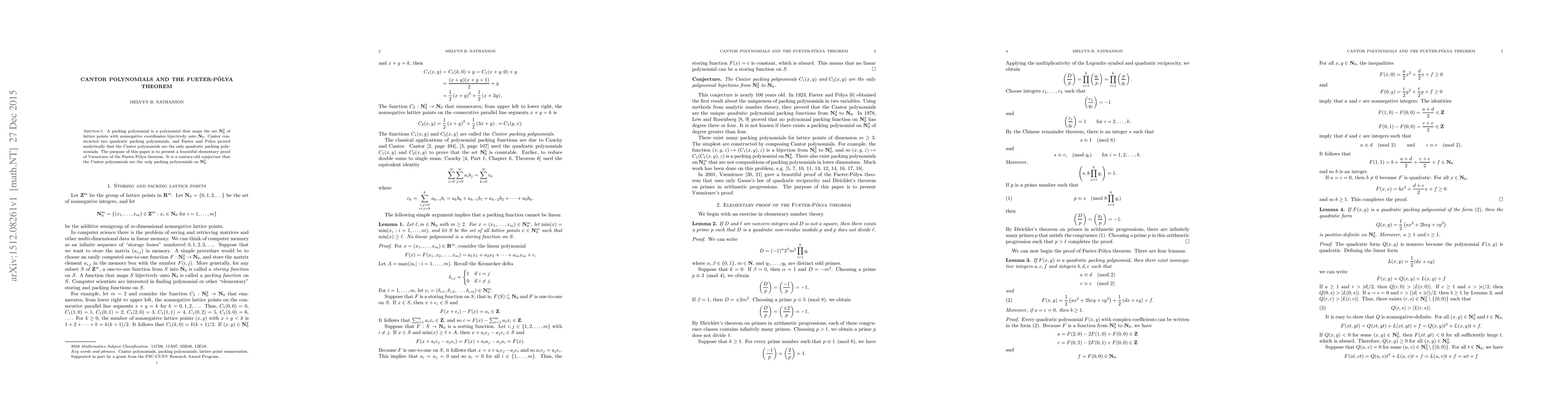 A packing polynomial is a polynomial that maps the set $\mathbf{N}_0^2$ of lattice points with nonnegative coordinates bijectively onto $\mathbf{N}_0$. Cantor constructed two quadratic packing polynomials, and Fueter and Polya proved analytically that the Cantor polynomials are the only quadratic packing polynomials. The purpose of this paper is to present a beautiful elementary proof of Vsemirnov of the Fueter-Polya theorem. It is a century-old conjecture that t