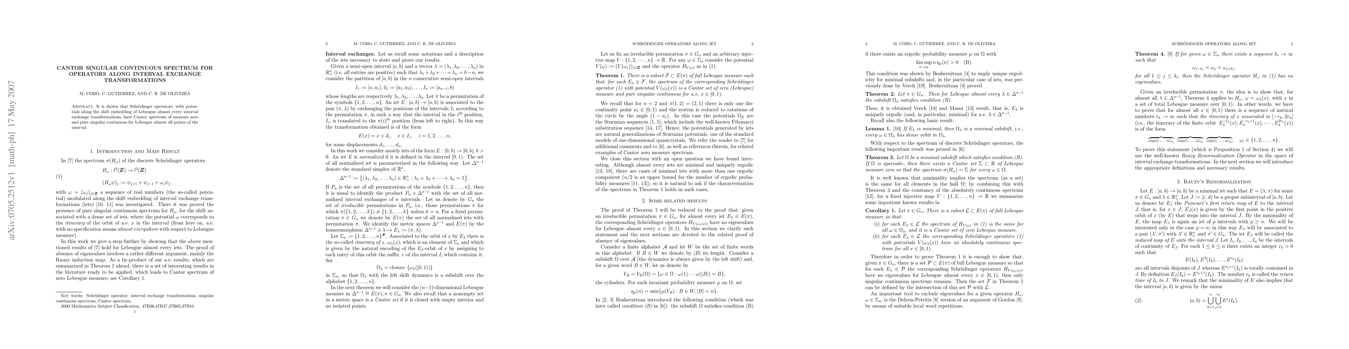 This paper demonstrates that Schrödinger operators with potentials derived from interval exchange transformations exhibit Cantor singular continuous spectrum of measure zero, which is pure singular continuous for almost every point in the interval.
