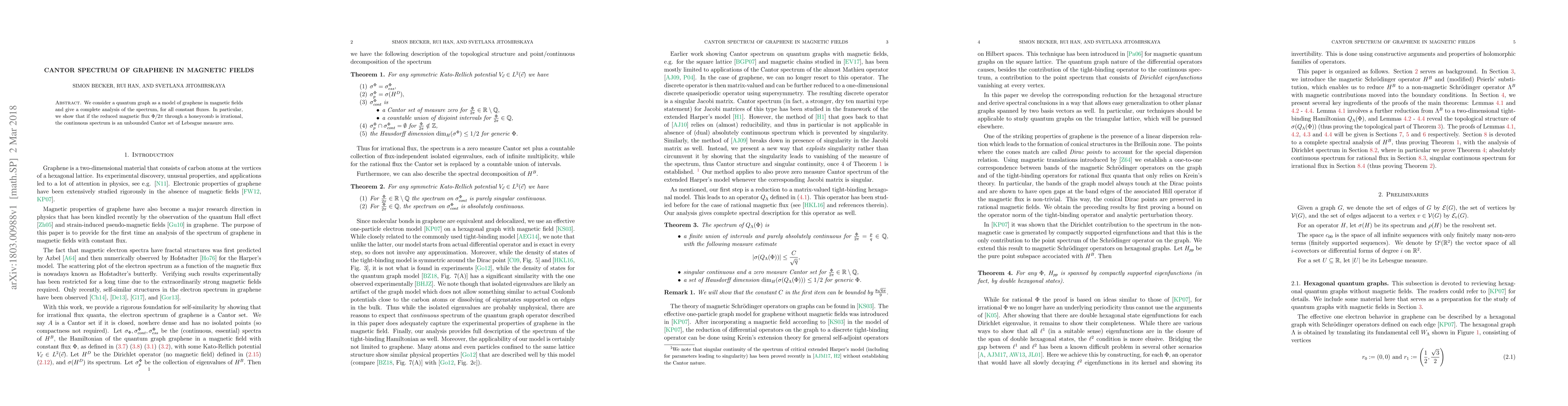 We consider a quantum graph as a model of graphene in magnetic fields and give a complete analysis of the spectrum, for all constant fluxes. In particular, we show that if the reduced magnetic flux $\Phi/2\pi$ through a honeycomb is irrational, the continuous spectrum is an unbounded Cantor set of Lebesgue measure zero.