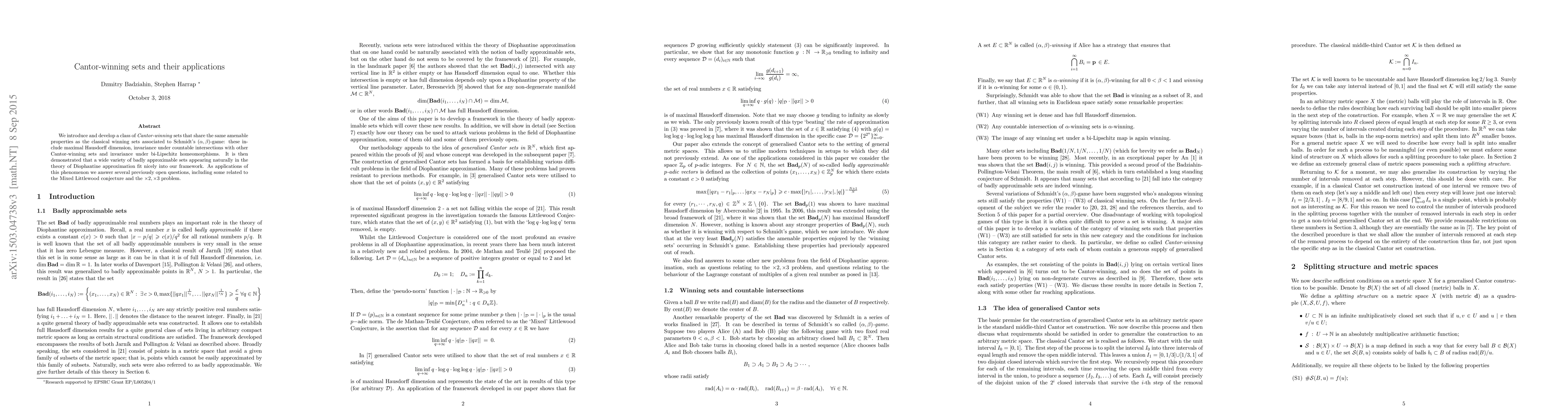This paper introduces Cantor-winning sets with properties similar to winning sets in Schmidt's $(\alpha,\beta)$-game, showing they fit various badly approximable sets from Diophantine approximation. Applications include resolving open questions related to the Mixed Littlewood conjecture and the $\times2, \times3$ problem.