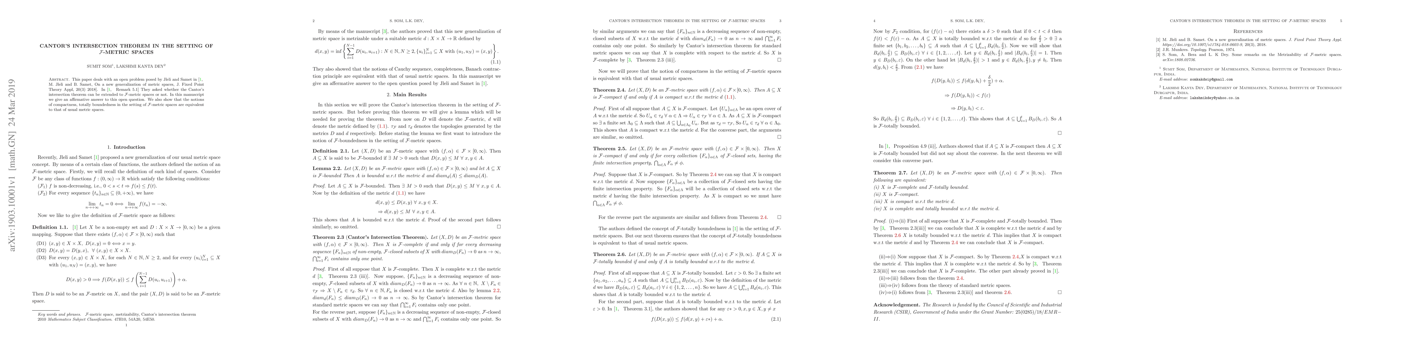This paper affirmatively addresses the open problem of extending Cantor's intersection theorem to $\mathcal{F}$-metric spaces, proving its validity in this setting. Additionally, it demonstrates the equivalence of compactness and total boundedness in $\mathcal{F}$-metric spaces to their usual metric counterparts.