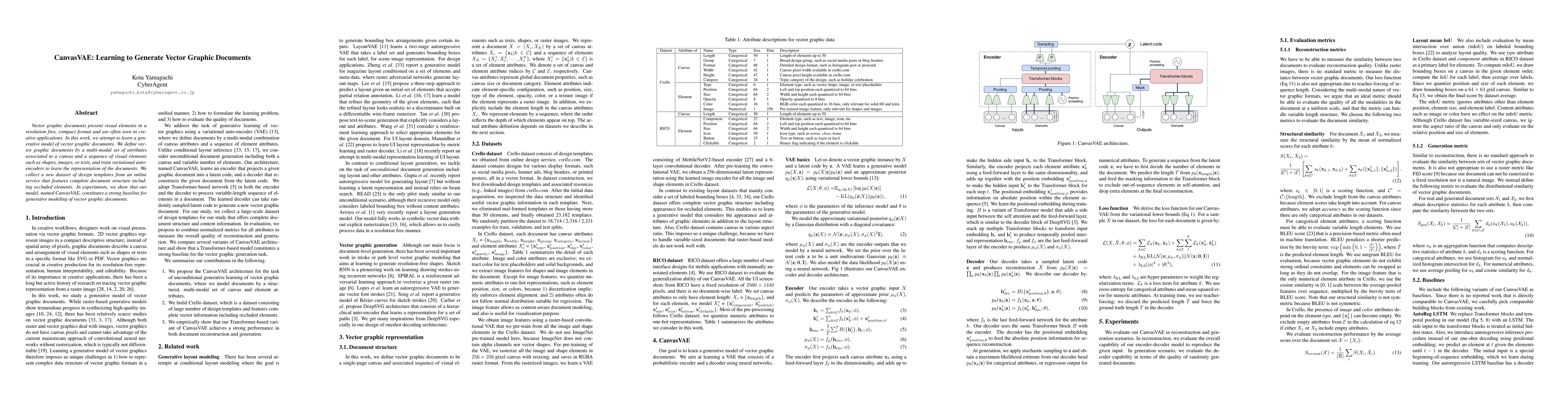 CanvasVAE employs variational auto-encoders to learn representations of vector graphic documents, defined by canvas attributes and sequences of shapes, images, and texts. The model demonstrates strong baseline performance for generating vector graphic documents, validated through a new dataset of design templates.