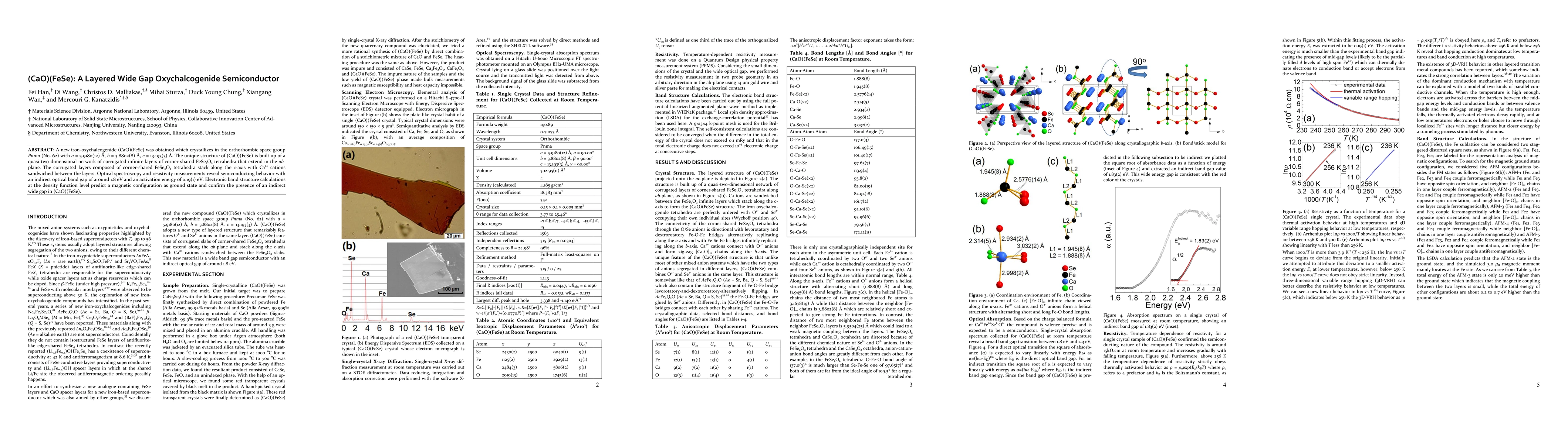 A new iron-oxychalcogenide (CaO)(FeSe) was obtained which crystallizes in the orthorhombic space group Pnma (No. 62) with a = 5.9180(12) {\AA}, b = 3.8802(8) {\AA}, c = 13.193(3) {\AA}. The unique structure of (CaO)(FeSe) is built up of a quasi-two-dimensional network of corrugated infinite layers of corner-shared FeSe2O2 tetrahedra that extend in the ab-plane. The corrugated layers composed of corner-shared FeSe2O2 tetrahedra stack along the c-axis with Ca2+ cations sandwiched between the layers. Optical spectroscopy and resistivity measurements reveal semiconducting behavior with an indirect optical band gap of around 1.8 eV and an activation energy of 0.19(1) eV. Electronic band structure calculations at the density function level predict a magnetic configuration as ground state and confirm the presence of an indirect wide gap in (CaO)(FeSe).