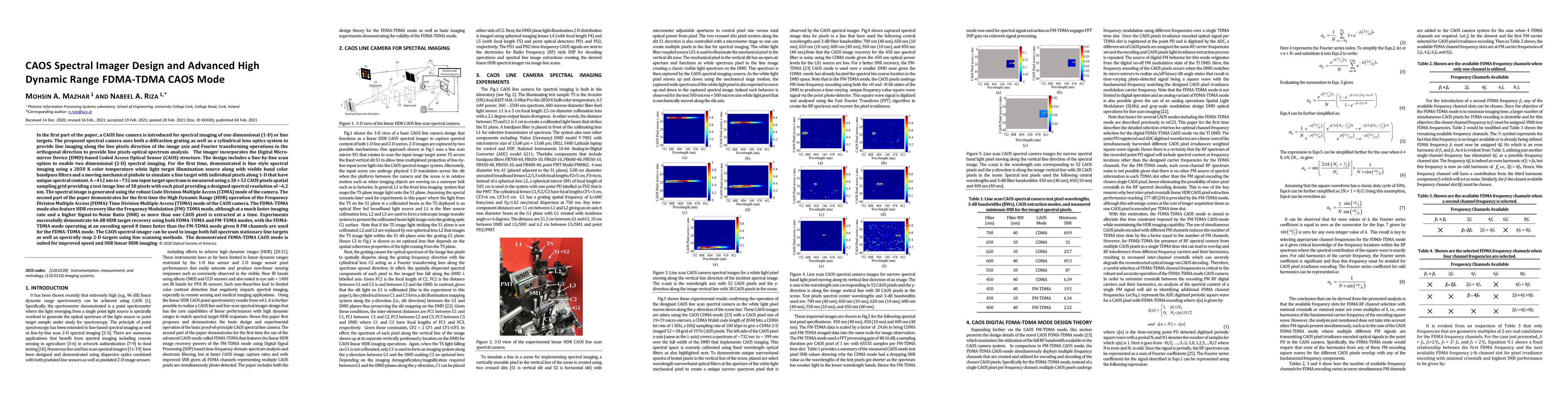 The paper introduces a CAOS line camera for spectral imaging using a diffraction grating and cylindrical lens, enabling line-by-line scanning for 2D spectral imaging. The camera employs a DMD-based CAOS structure and demonstrates spectral imaging of a 2850 K white light source with a spectral resolution of ~6.2 nm. The paper also presents the High Dynamic Range (HDR) operation of the camera's FDMA-TDMA mode, achieving faster imaging rates and higher SNR compared to FM-TDMA.