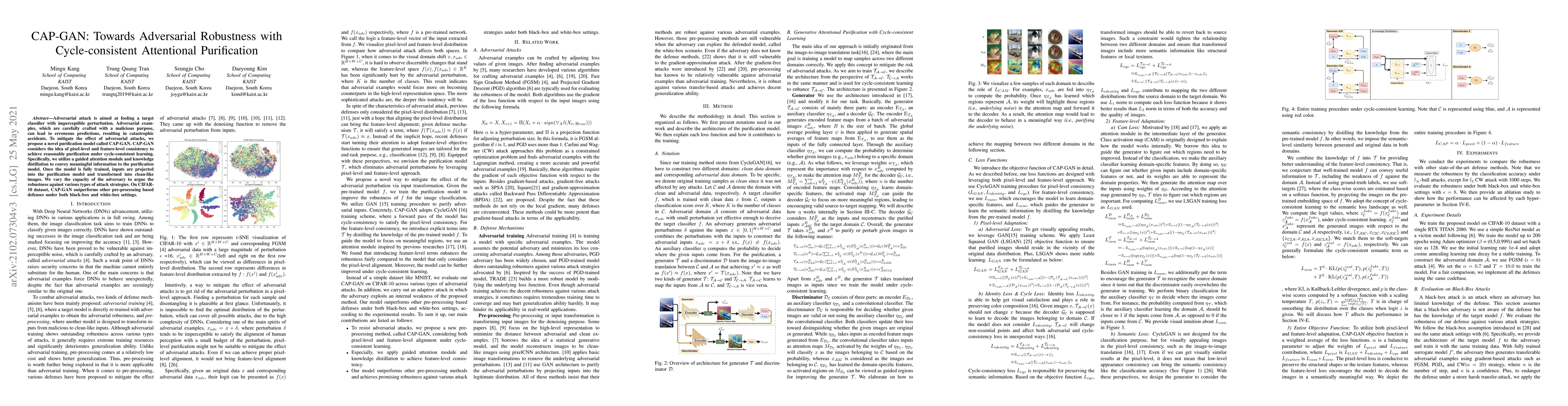 CAP-GAN proposes a novel purification model to enhance adversarial robustness through cycle-consistent attentional purification, utilizing guided attention and knowledge distillation. It outperforms other defenses on the CIFAR-10 dataset under various attack strategies.