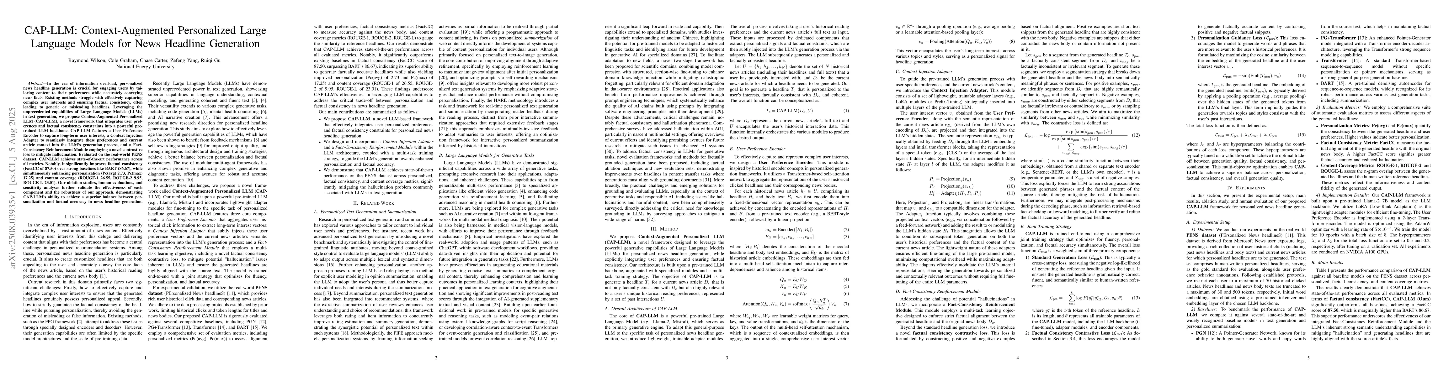 In the era of information overload, personalized news headline generation is crucial for engaging users by tailoring content to their preferences while accurately conveying news facts. Existing methods struggle with effectively capturing complex user interests and ensuring factual consistency, often leading to generic or misleading headlines. Leveraging the unprecedented capabilities of Large Language Models (LLMs) in text generation, we propose Context-Augmented Personalized LLM (CAP-LLM), a novel framework that integrates user preferences and factual consistency constraints into a powerful pre-trained LLM backbone. CAP-LLM features a User Preference Encoder to capture long-term user interests, a Context Injection Adapter to seamlessly integrate these preferences and current article context into the LLM's generation process, and a Fact-Consistency Reinforcement Module employing a novel contrastive loss to mitigate hallucination. Evaluated on the real-world PENS dataset, CAP-LLM achieves state-of-the-art performance across all metrics. Notably, it significantly improves factual consistency (FactCC of 87.50) over strong baselines like BART (86.67), while simultaneously enhancing personalization (Pc(avg) 2.73, Pc(max) 17.25) and content coverage (ROUGE-1 26.55, ROUGE-2 9.95, ROUGE-L 23.01). Our ablation studies, human evaluations, and sensitivity analyses further validate the effectiveness of each component and the robustness of our approach, demonstrating CAP-LLM's ability to achieve a superior balance between personalization and factual accuracy in news headline generation.