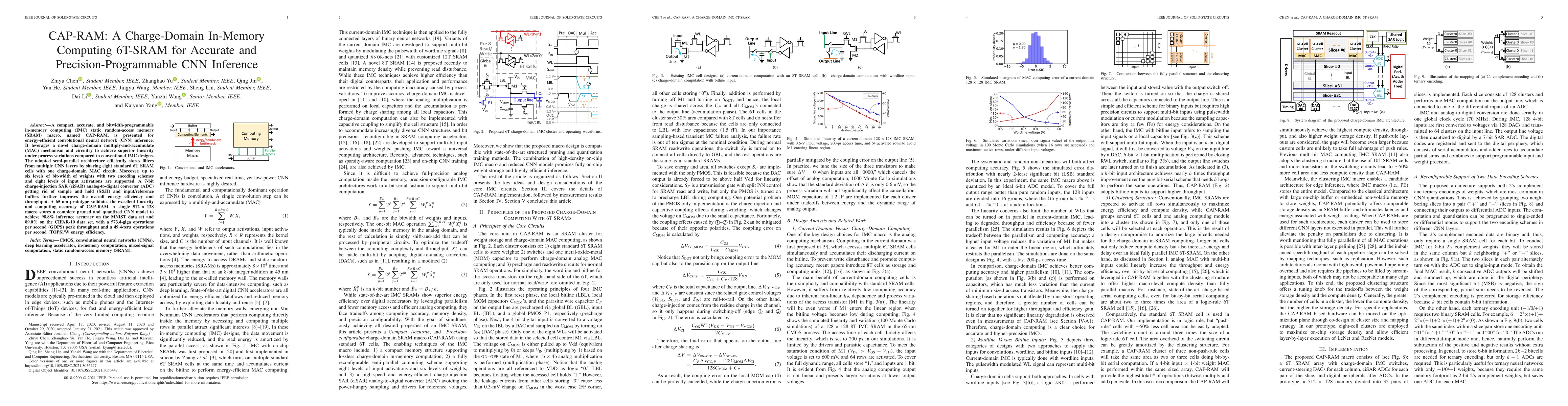 CAP-RAM is an innovative 6T-SRAM for energy-efficient CNN inference, utilizing a charge-domain MAC mechanism to enhance linearity and accuracy. It supports multiple bit-widths and integrates a 7-bit SAR ADC to improve efficiency, achieving high accuracy and throughput in a compact prototype.